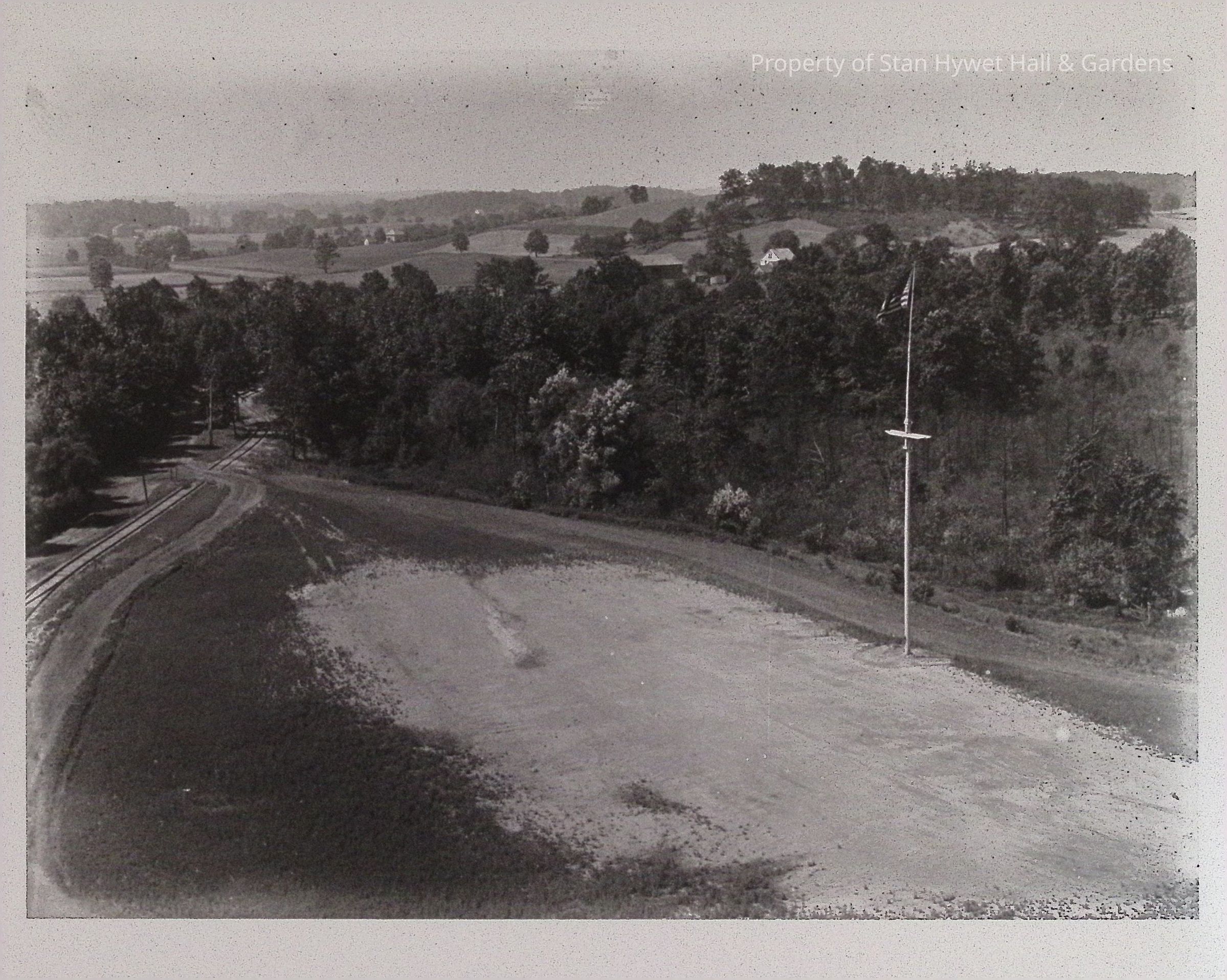 Print developed from gelatin dry plate glass negative. Aerial view of Wingfoot Lake launching field behind the hangar. Trees in full foliage line the field, railroad tracks run from diagonally lower left to upper right along the center left edge of photo with a dirt road running parallel. Field is covered with grass and dirt. On the right edge of dirt portion of field stands flagpole with American flag. Behind flagpole trees cover background. Trees in background portions of cleared land and farm buildings are visible.Photograph Details