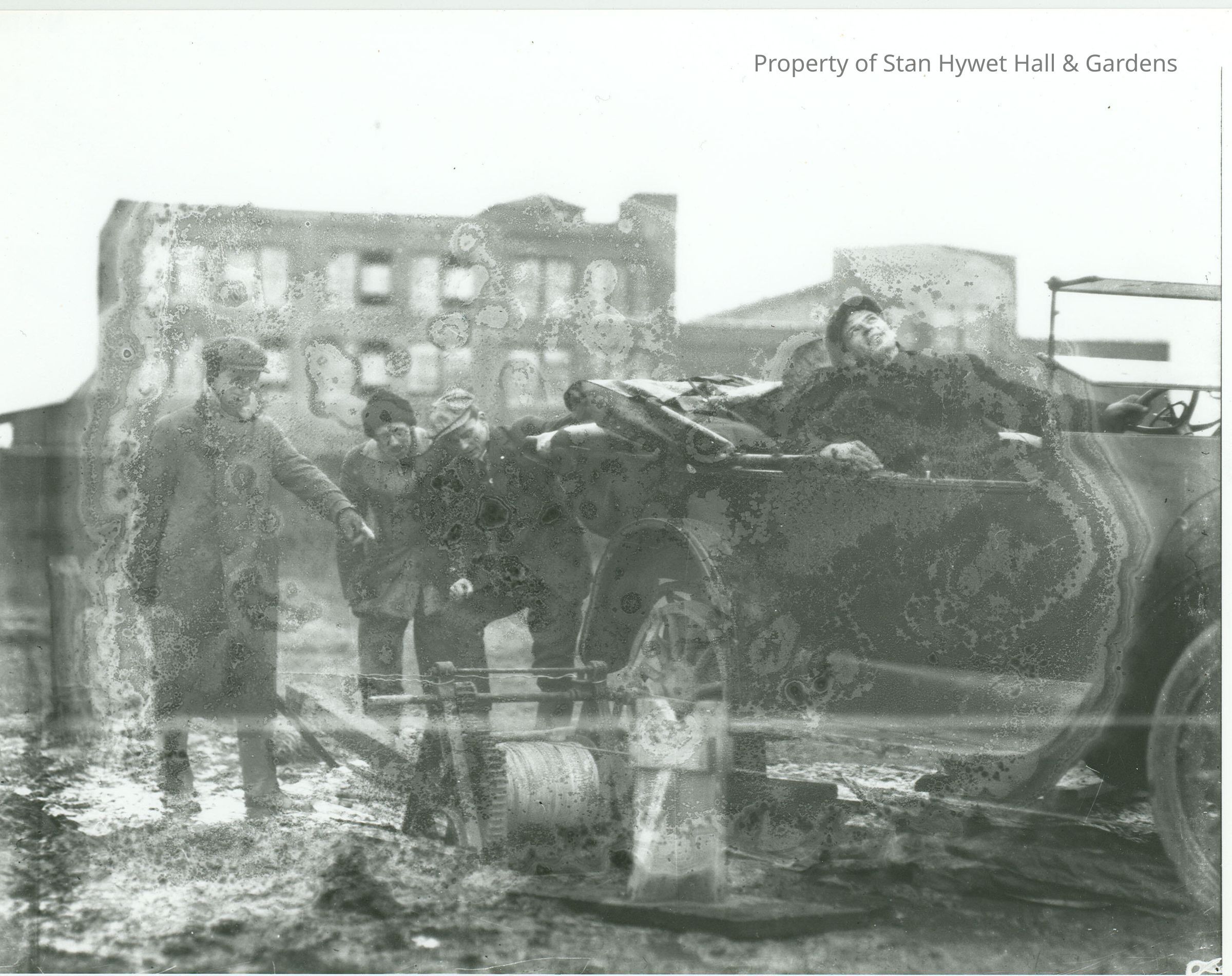 Print developed from gelatin dry plate glass negative. Three men observe winch (device used to pull down balloon connected by cables) on muddy ground. Man at far left points directly at winch. Two men near center stand slightly bent over behind car looking at winch. Man seated in car in right side of image looks up toward sky. Men wear winter attire. Rear car wheels supported on wooden boards. Possibly at Wingfoot Lake in Suffield, Ohio. Buildings (possibly factory(?) buildings next to Wingfoot hangar) in background. Same men as in SHH 2001.428R, SHH 2001.430R. Series of winch and ballooning prints.Collection