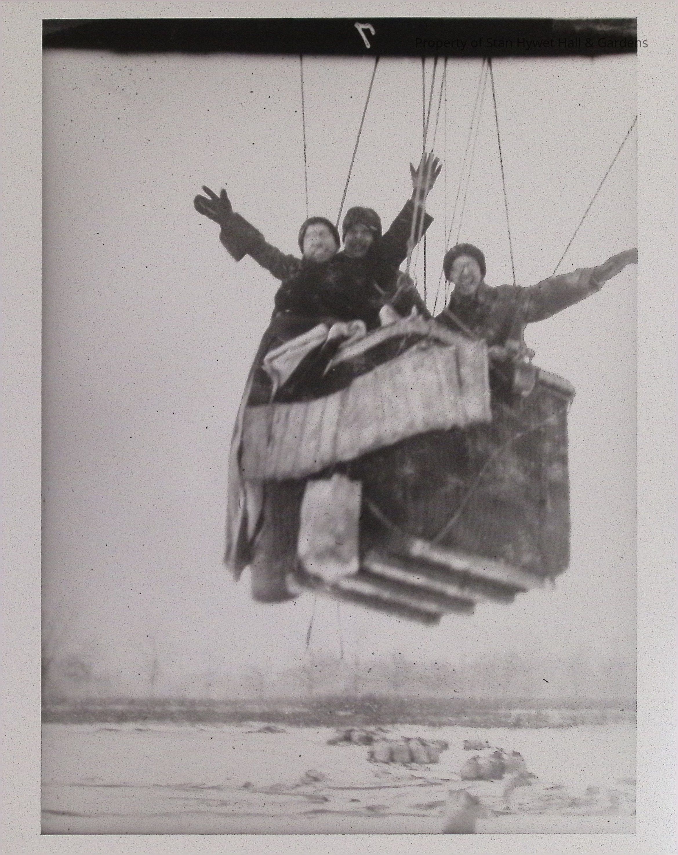 Print developed from gelatin dry plate glass negative. Three unidentified men in an observation balloon basket. From left to right: Man in basket, facing camera, wears dark colored hat over ears, dark colored coat, and waves with left hand which is gloved. Man in middle, also facing camera, wears similar clothing and waves with right hand. Man on right, faces camera, waves with left hand and wears glasses and clothing similar to other men in image. Ropes extend upward from basket. Trees without leaves line background and snows covers foreground.Collection