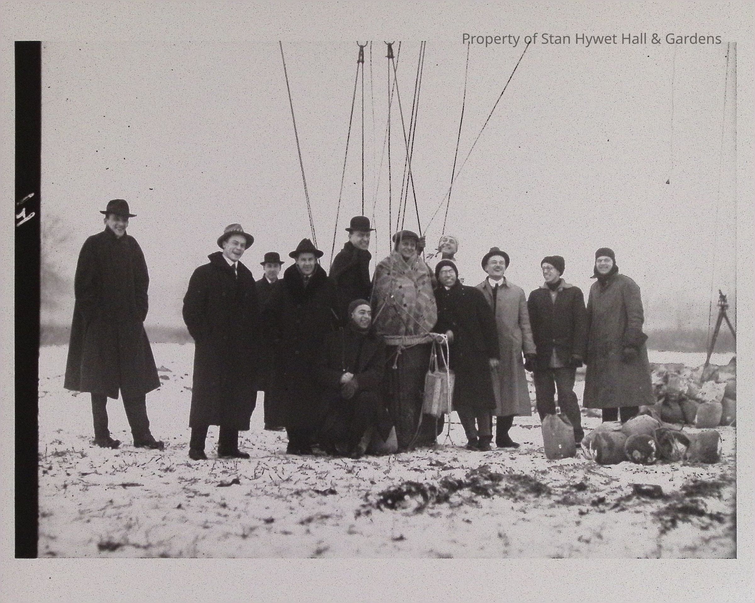 Print developed from gelatin dry plate glass negative. Twelve unidentified men in airfield. 3 men in basket of balloon, which is grounded. All men face camera and smile. Ropes extend upward from basket. Weighted bags are collected along right center edge of image. Snow covered ground and trees without leaves in background.Photograph Details