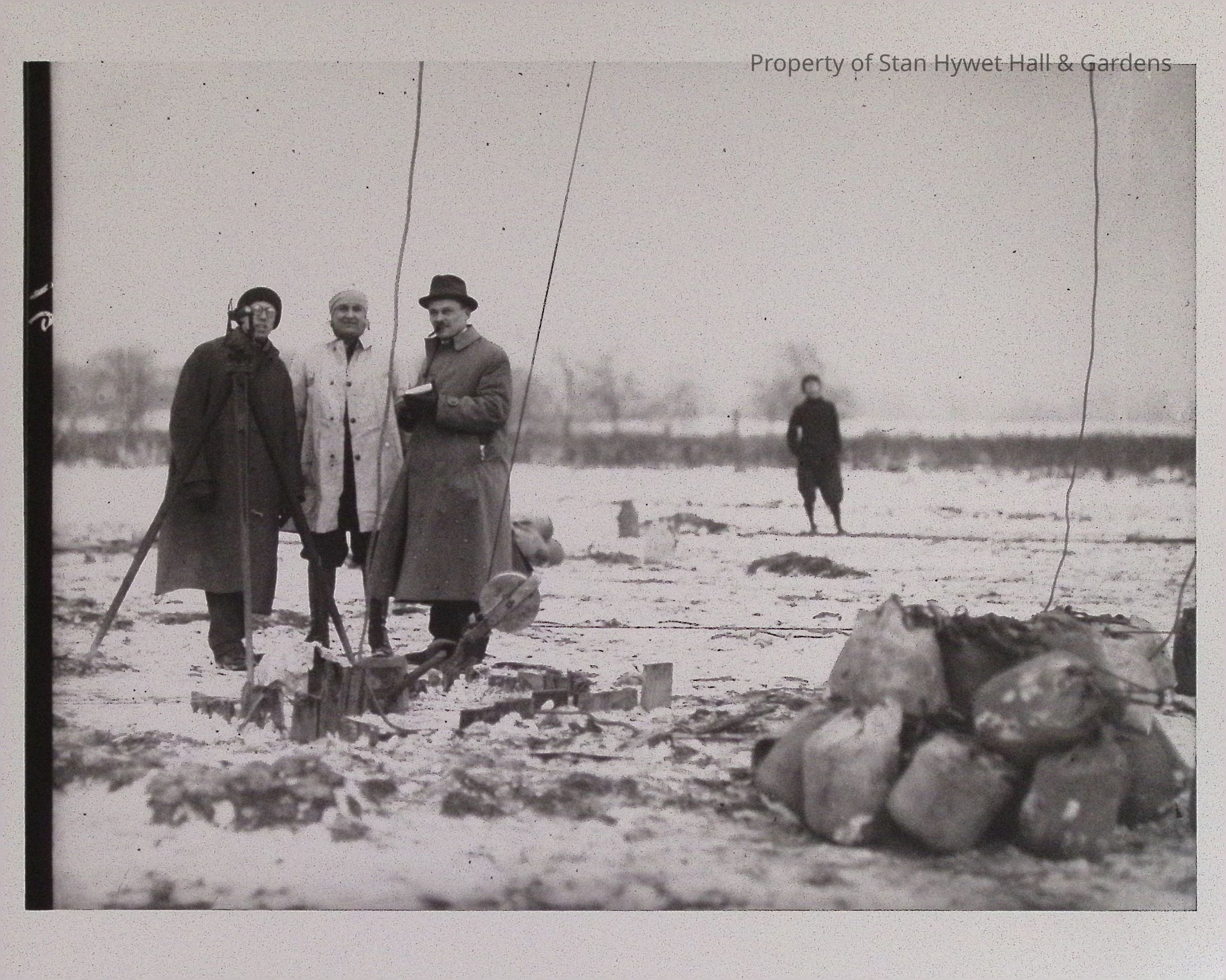 Print developed from gelatin dry plate glass negative. Four unidentified men in airfield, three of which stand by instrument on tripod. From left to right: Man stands behind instrument on tripod wearing dark colored hat, round glasses, and long dark colored coat with gloves. Man in middle wears light colored hat and long coat with dark colored boots. Man on right, with cigar, wears dark colored hat with brim, long dark colored coat with gloves, and holds pad of paper. In front of men near instrument on tripod ropes extend upward beyond visible portion of picture. In immediate foreground on right weighted bags are collected on ground. In background man in all dark colored clothing stands looking towards sky. Snow covered ground and trees without leaves line background.Photograph Details