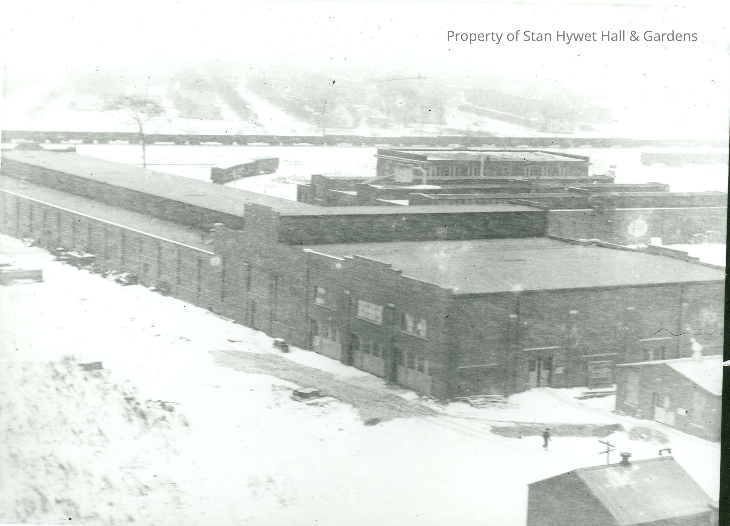 Print developed from gelatin dry plate glass negative. Aerial view of factory, rail yard and nearby grounds, possibly in Willard Ohio. Snow covered ground and tree in left background without leaves.Collection