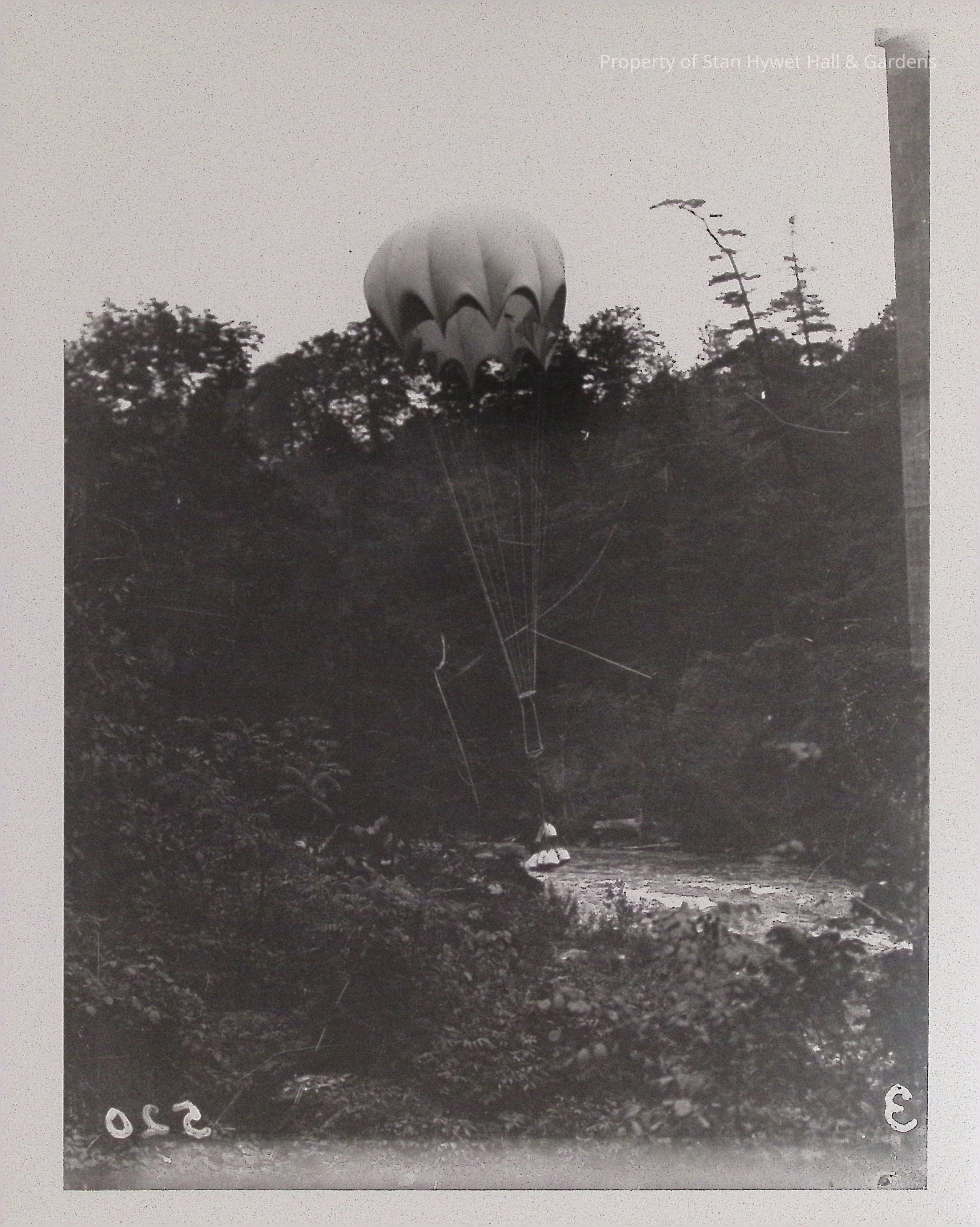 Print developed from gelatin dry plate glass negative. Weighted parachute being dropped from a bridge, almost landing in river. Bushes and small trees in foreground. Trees in background. Support pillar of bridge visible on far right. Series of parachute drops.Collection