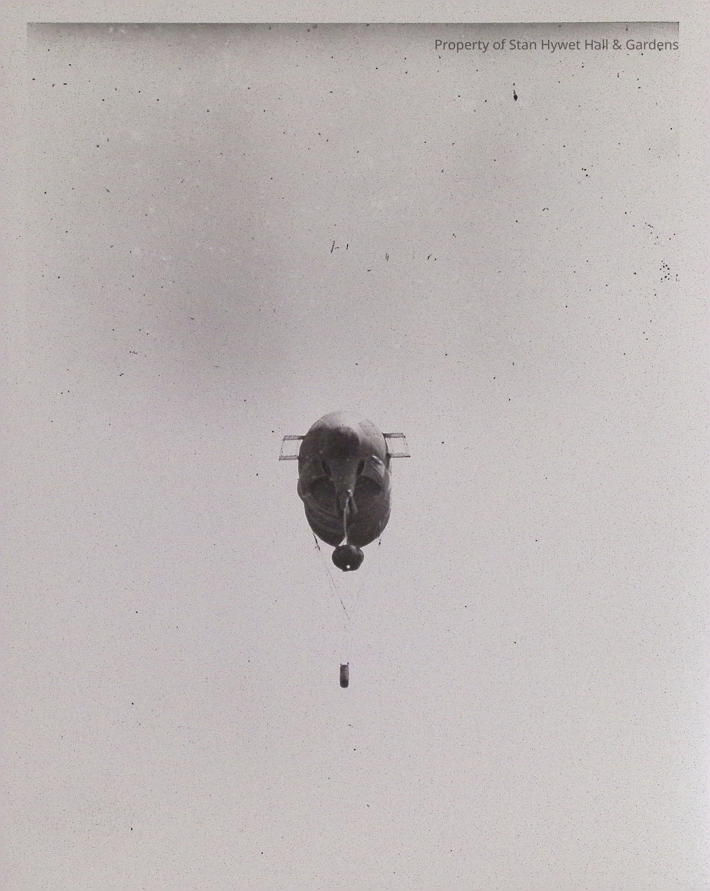 Print developed from gelatin dry plate glass negative. Distant rear view of an observation balloon (center) in sky with basket and windsock. Cables hang from balloon at Wingfoot Lake in Suffield, Ohio. Series of Observation Balloon prints.Photograph Details
