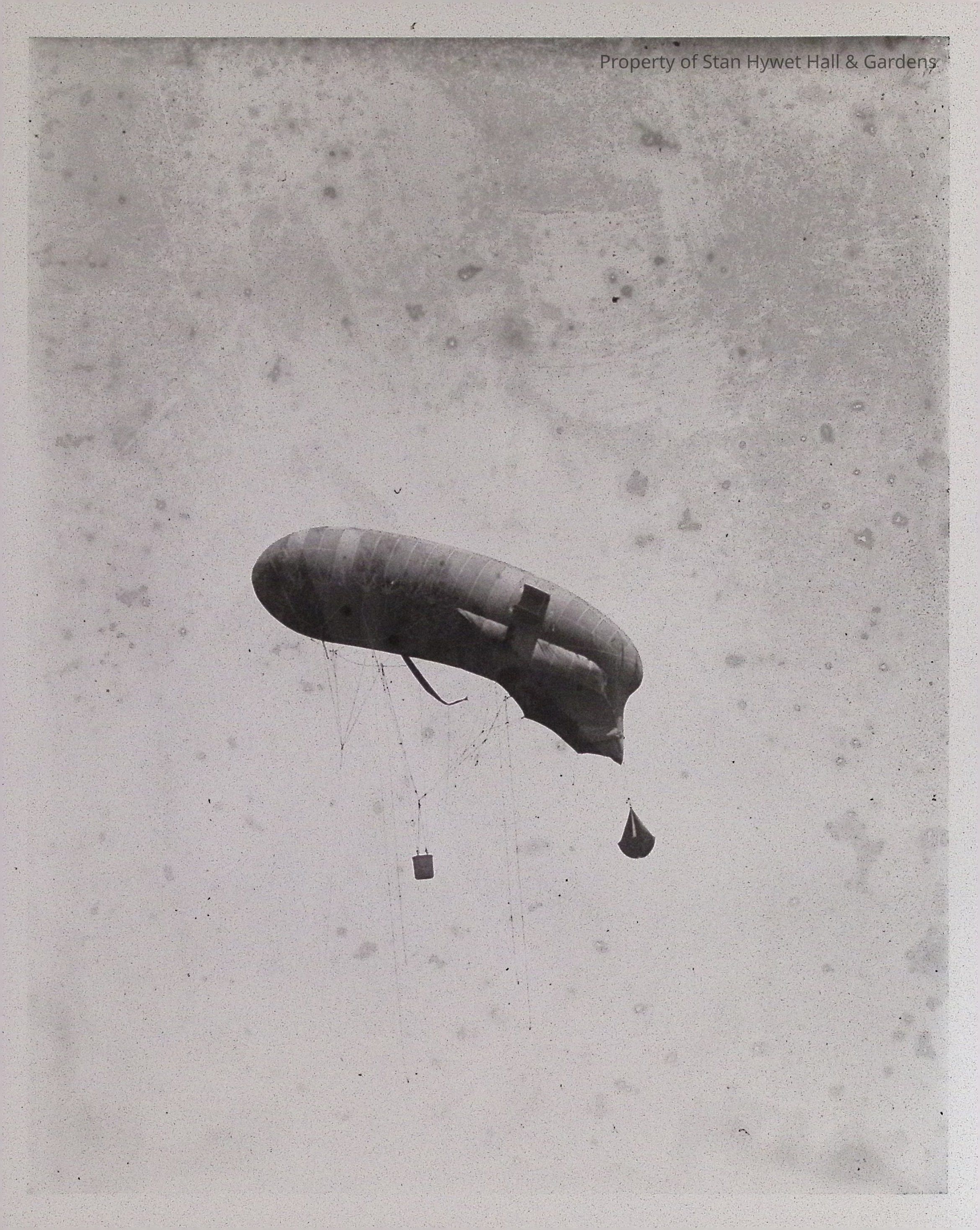 Print developed from gelatin dry plate glass negative. Distant side view of an observation balloon (center) with basket and windsock in sky. Cables hang from balloon. Possibly at Wingfoot Lake in Suffield, Ohio. Series of Observation Balloon prints.Photograph Details