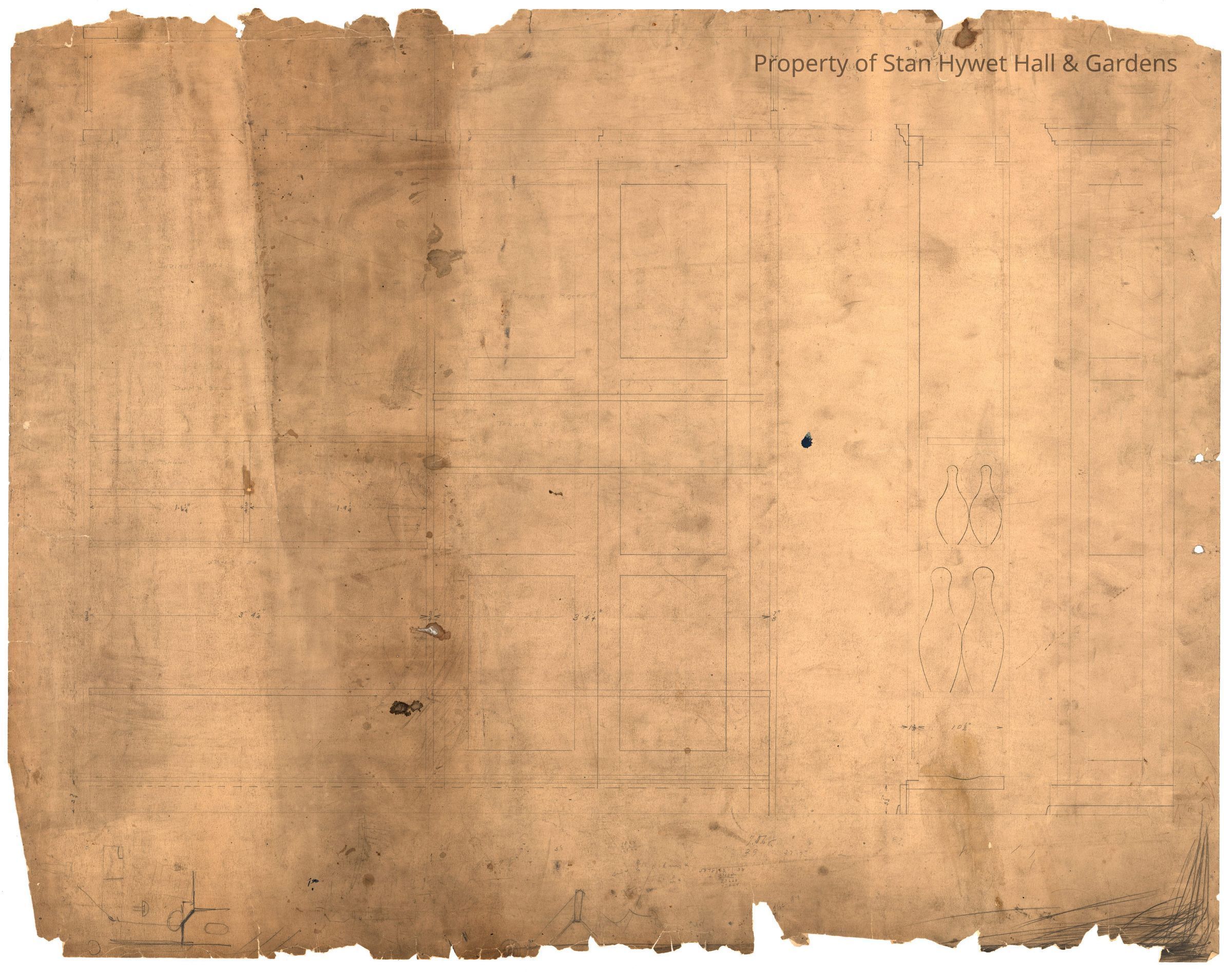 Historic drawing: Gymnasium storage cabinets showing bowling pins. (reverse of SHH 2023.172.408a)Collection