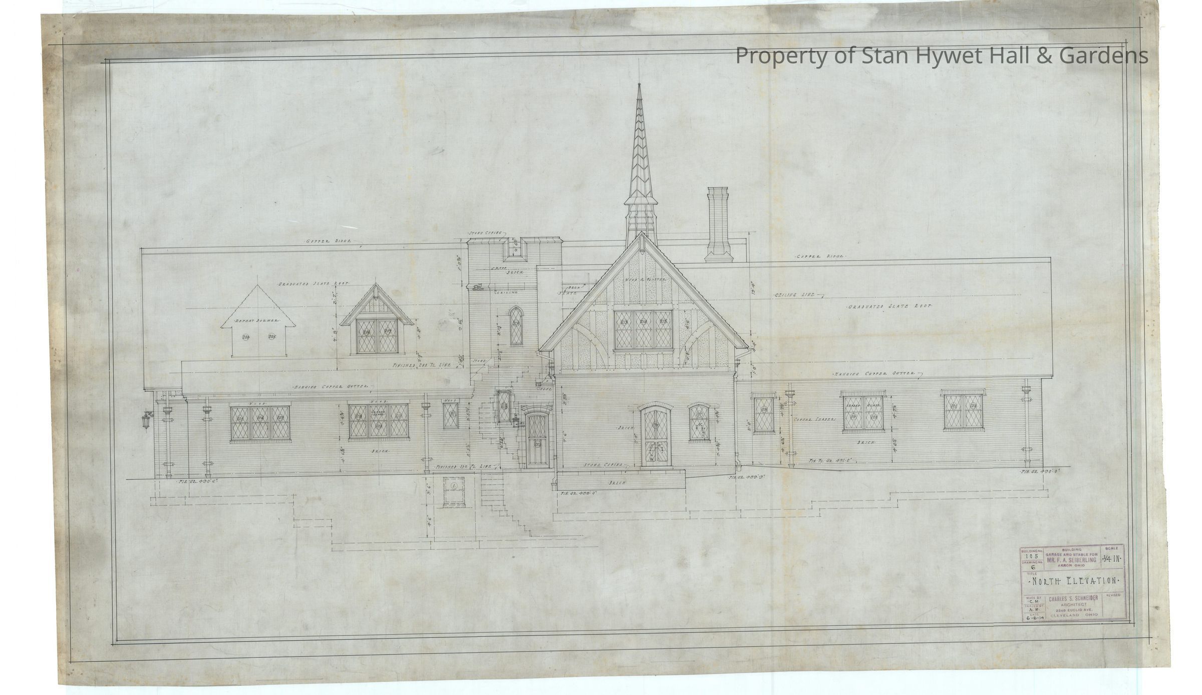 Historic blueprint: North elevation of the Carriage House on the Stan Hywet estate. Titled "North Elevation".