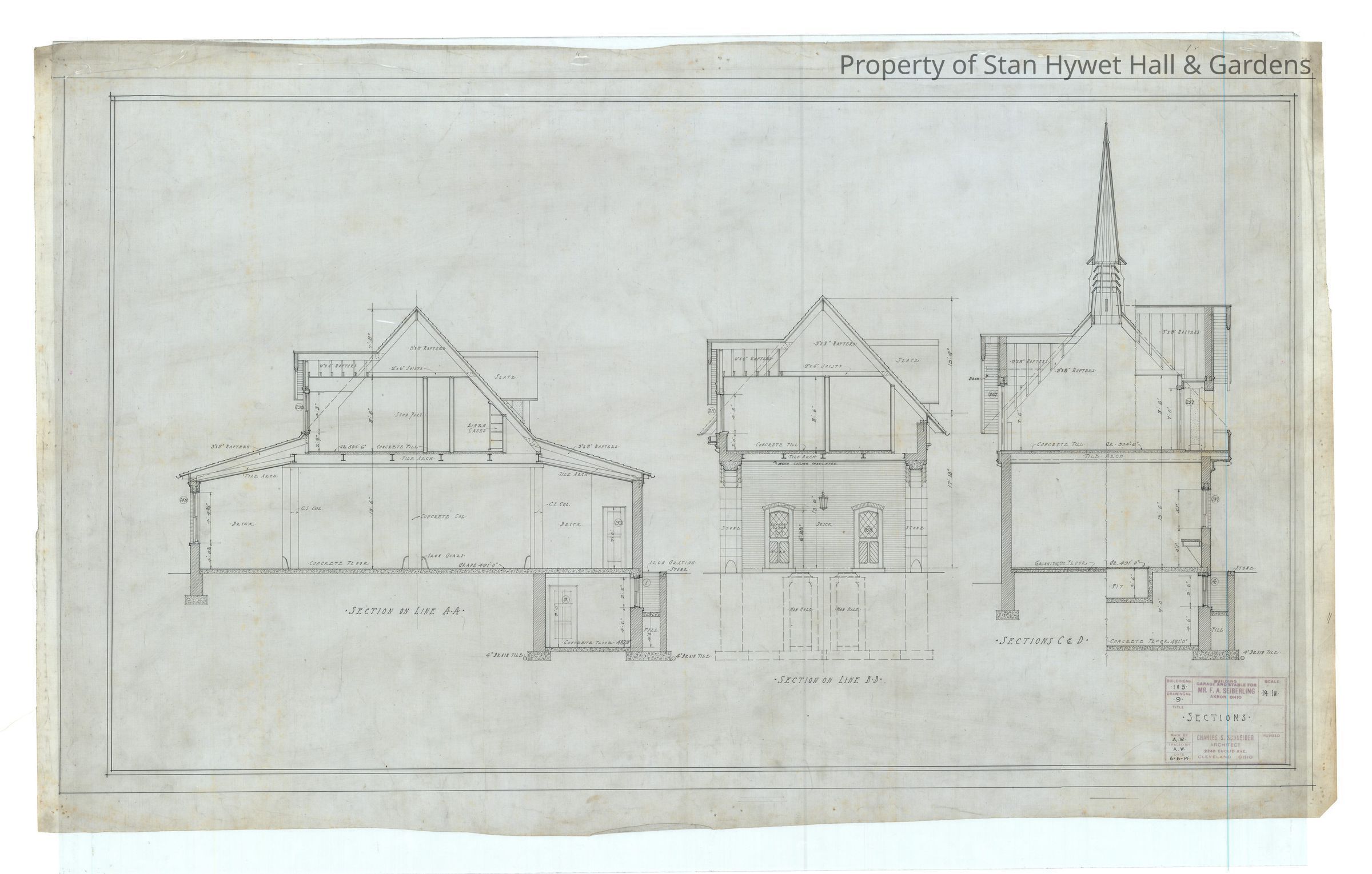 Historic blueprint: Sections of the Carriage House on the Stan Hywet estate. Titled "Sections".