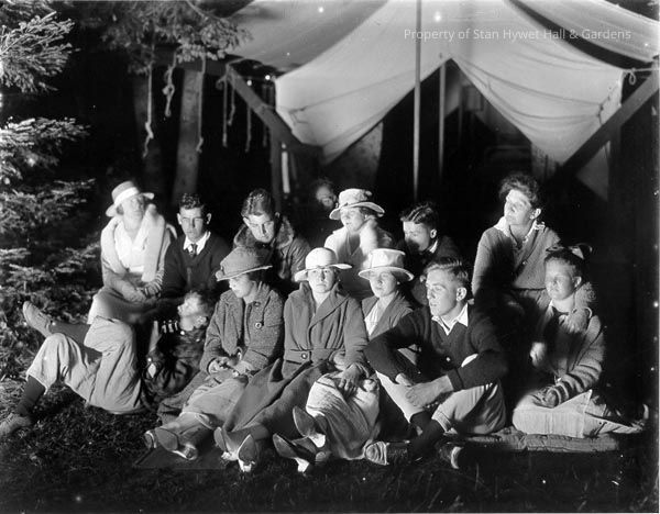 Black and white photograph of thirteen young adults, seven men and six women, sitting outdoors at night in two rows in front of tent with flaps tied open. Virginia Seiberling sits in the center of the back row wearing a light colored hat with flowers on the band with her left hand near her ear. People are dressed in sweaters and coats. Five women wearing hats. Man in 1st row on far left appears to be laid back playing a string instrument. Only the head and tuning keys are visible. Series of campsite photos.Photograph Details