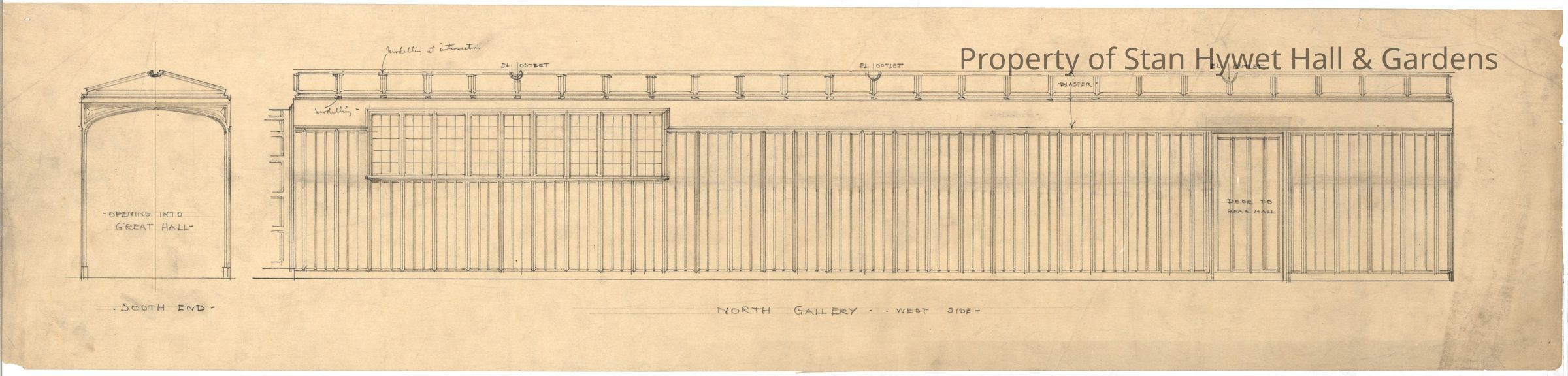Historic drawing: Detailed plan of the North Hallway's west wall and south doorway into Great Hall. Titled "North Gallery: West Side".Collection