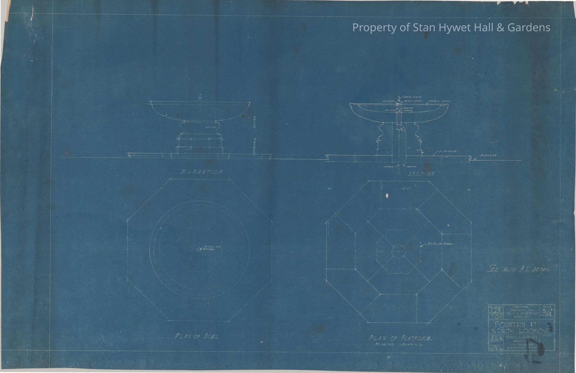 Historic Blueprint: Plans and elevations of Tea House fountain. Titled "Fountain at North Lookout".