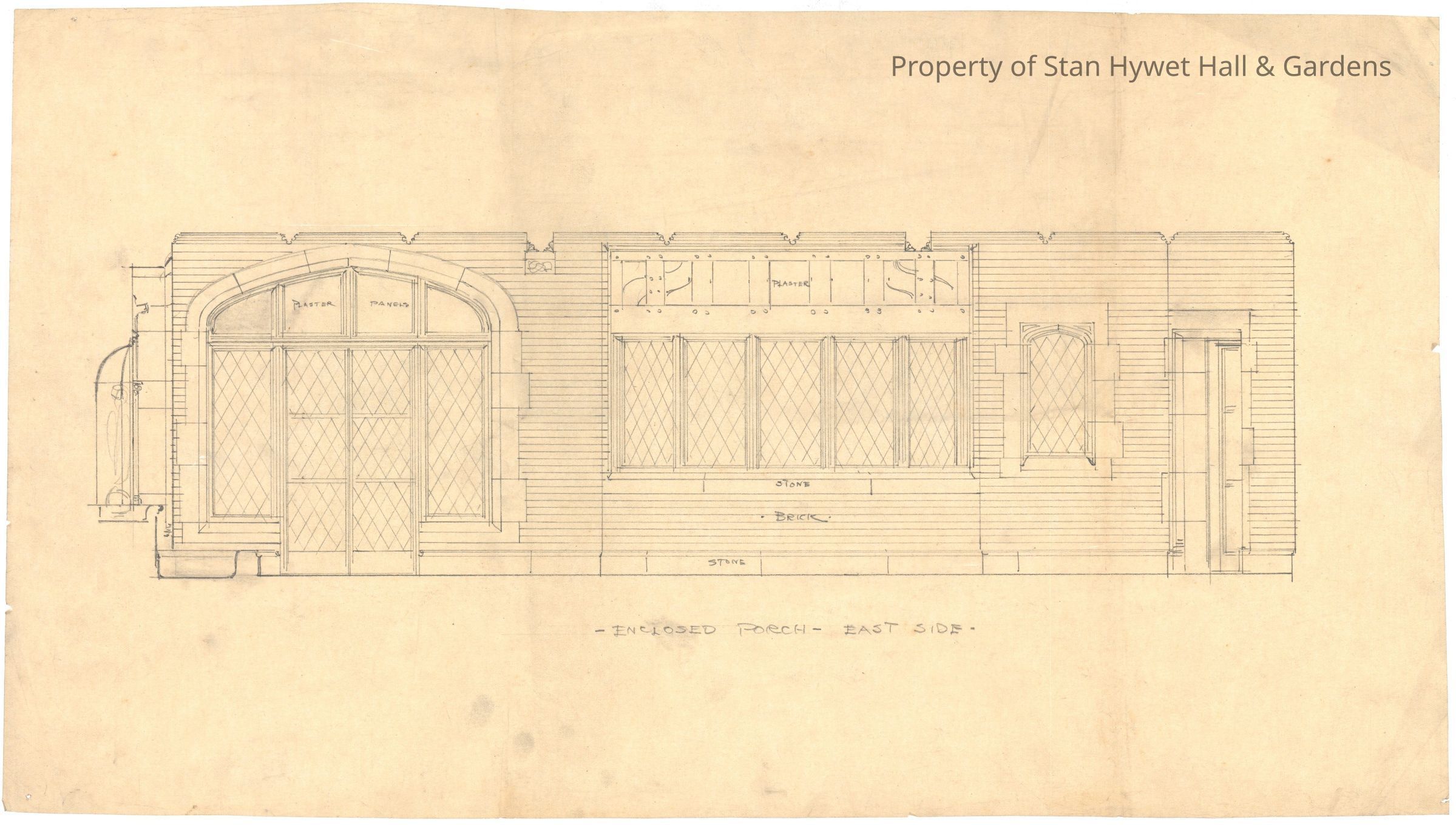 Historic drawing: Detailed drawing of the West Porch's east wall. Titled "Enclosed Porch East Side".Collection