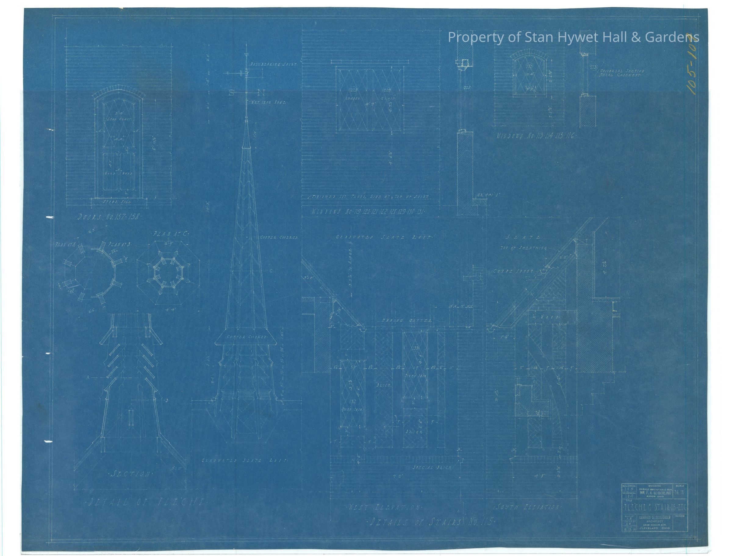 Historic blueprint: Drawing of the fleche and stair elevations for the Carriage House. Titled "Fleche & Stair 115-Etc."
