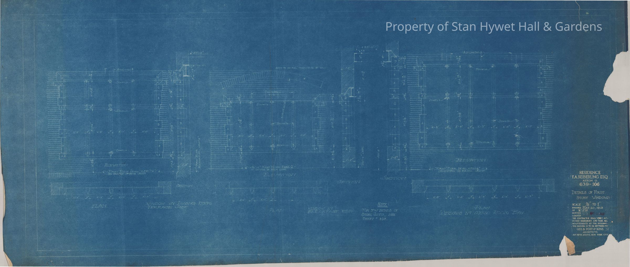 Historic blueprint: Detailed drawings of windows on the first floor, specifically the Music Room bay, Breakfast Room, and Dining Room. Titled "Detail of First Story Windows".