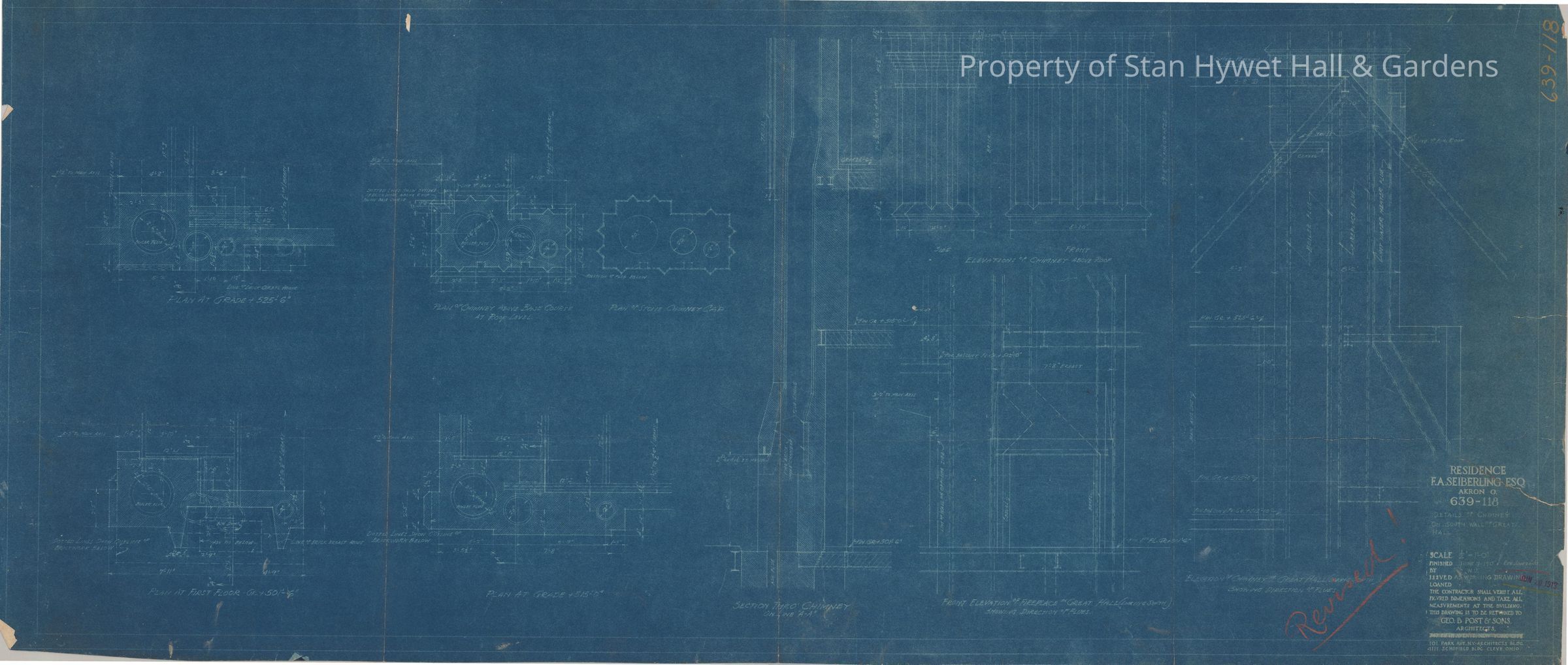 Historic blueprint: Detailed drawing of the Great Hall chimney, including plans of the chimney on different floors of the house. Titled "Details of Chimney on South Wall of Great Hall".