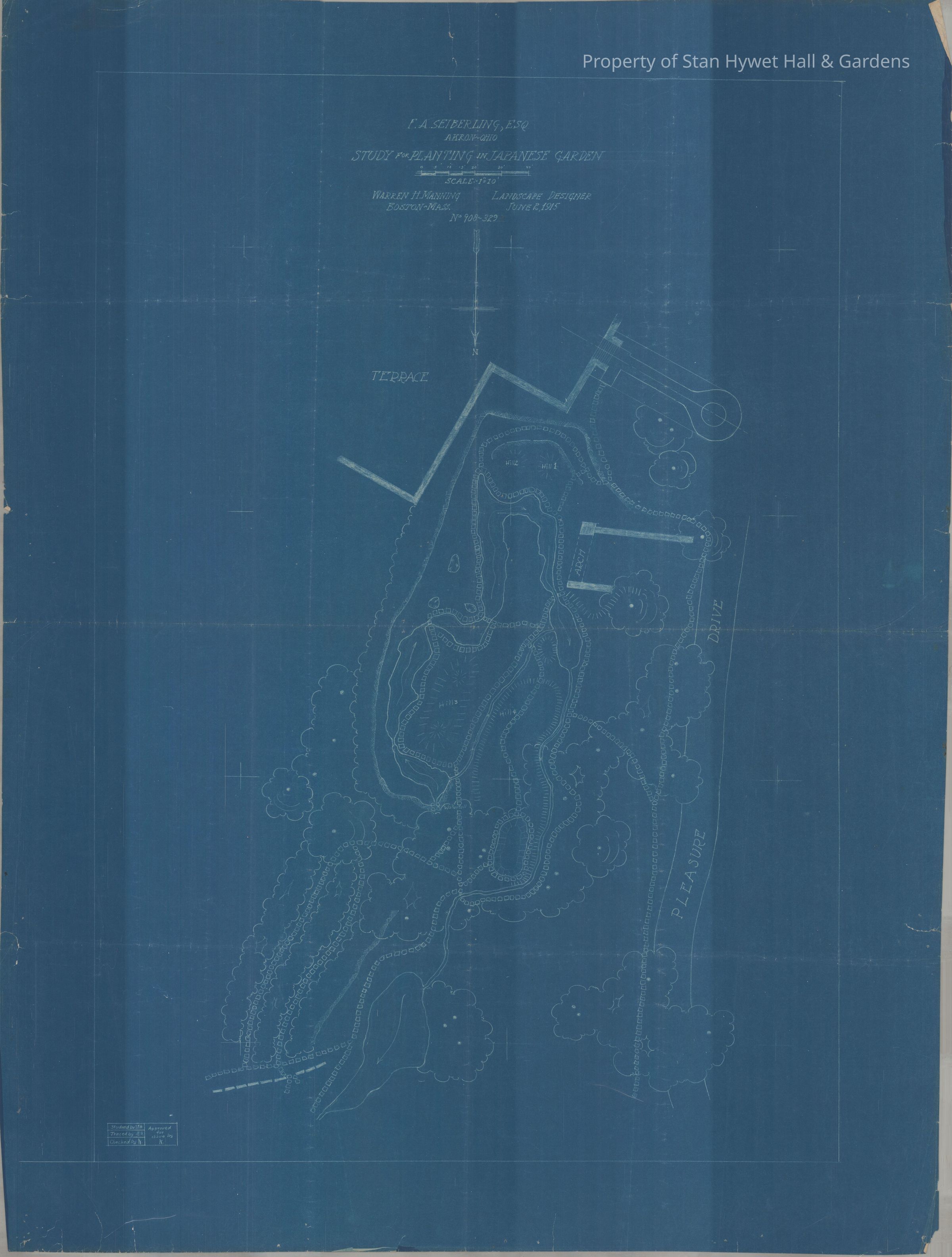Historic blueprint: Plan of Japanese Garden, including Pleasure Drive and portion of West Terrace and Overlook. Titled "Study for Planting in Japanese Garden".