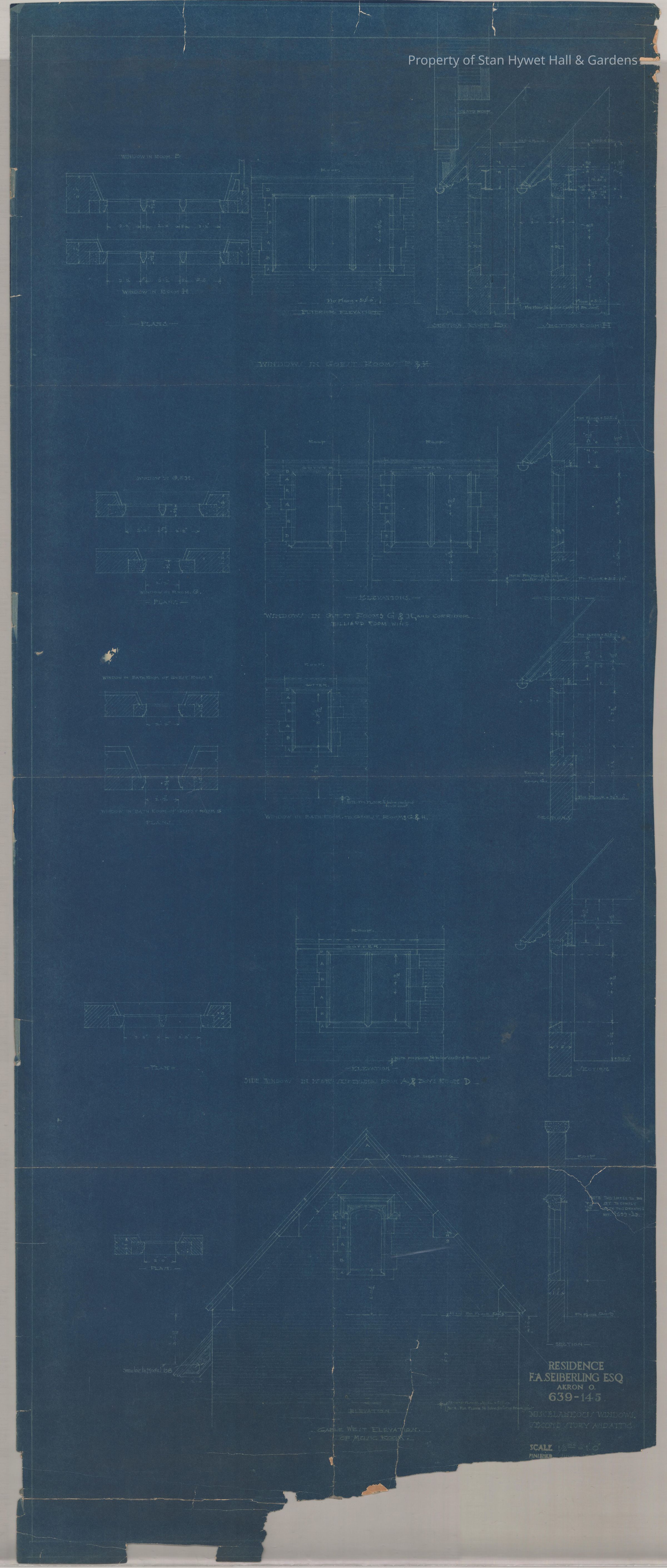 Historic blueprint: Drawings of several windows on the second floor and attic, including several of the guest and family bedrooms. Titled "Miscellaneous Windows Second Story and Attic".
