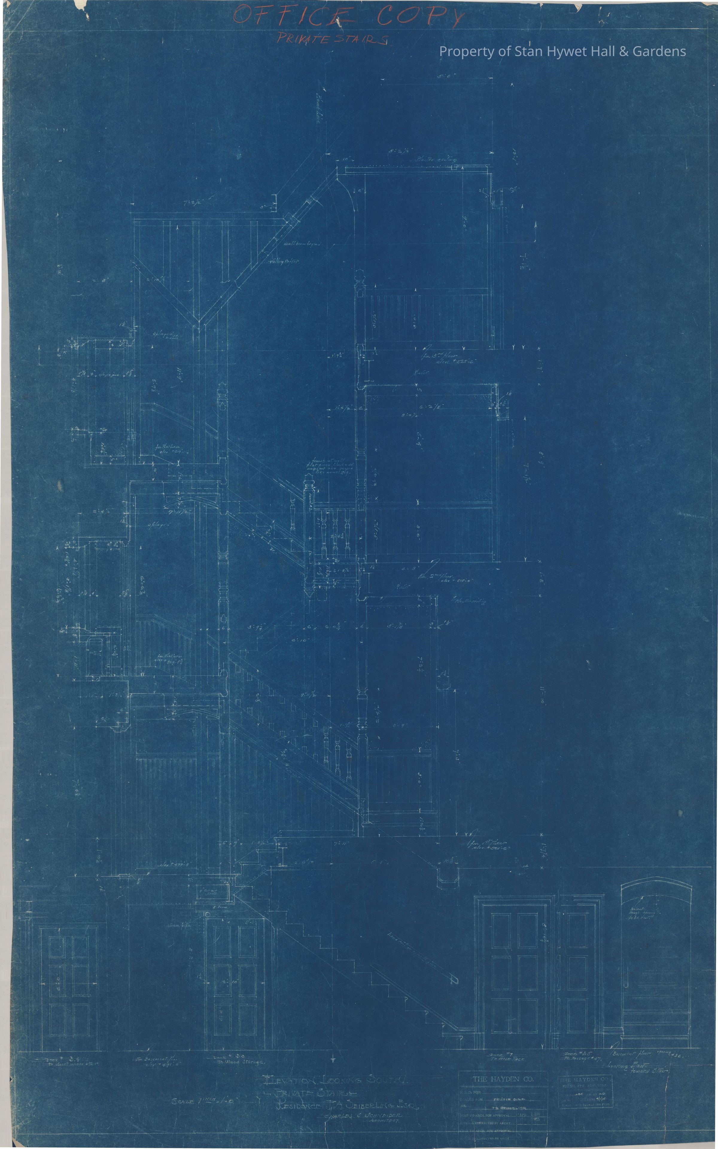 Historic Blueprint: Detailed drawing of the Private Stairs' south wall including stairs from the Dormitory down to the Basement. Titled "Elevation Looking South-Private Stairs".