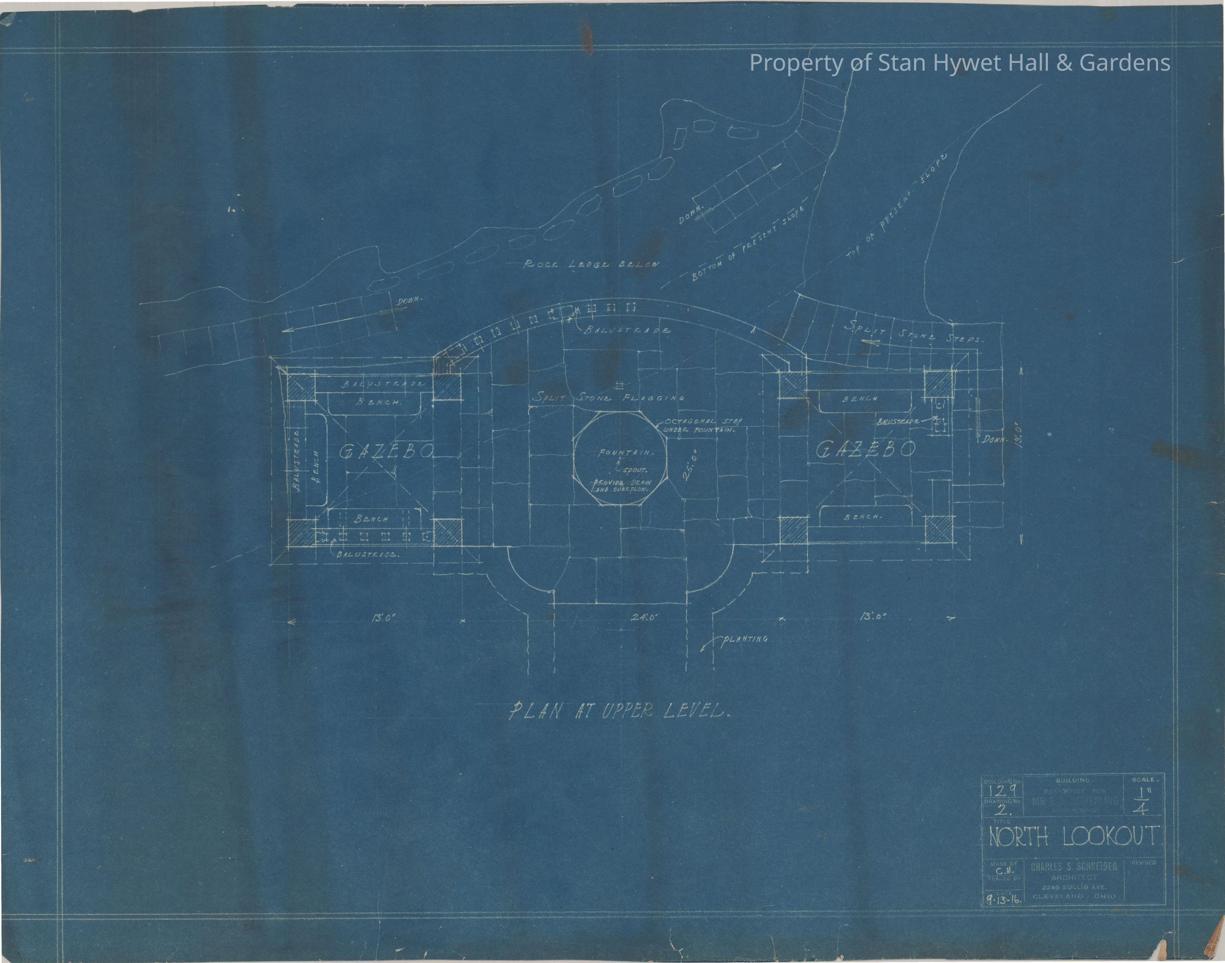 Historic Blueprint: Plan of upper level of Tea Houses. Titled "Plan at Upper Level; North Lookout".