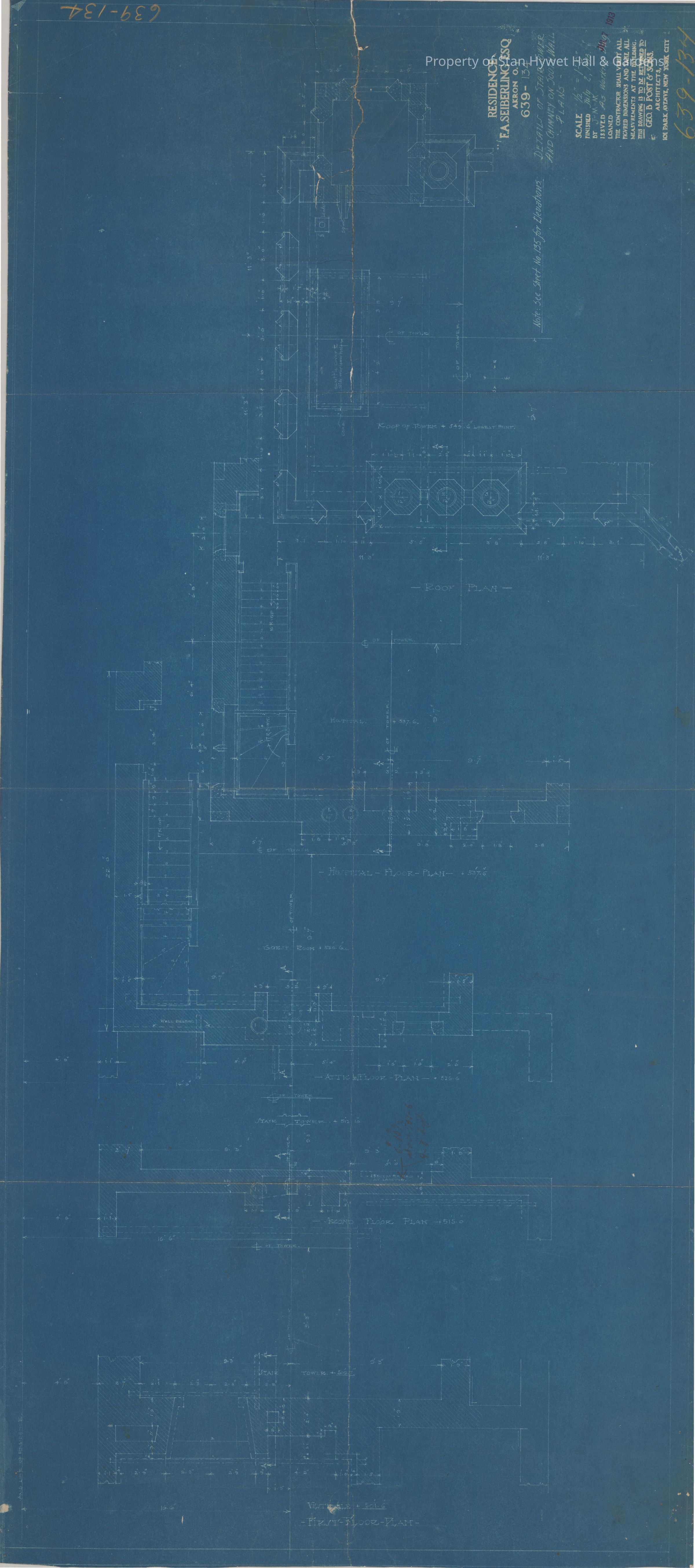 Historic blueprint: Detailed drawing of the Tower stairs and chimney. Titled "Details of Stair Tower and Chimney on South Wall-Plans".