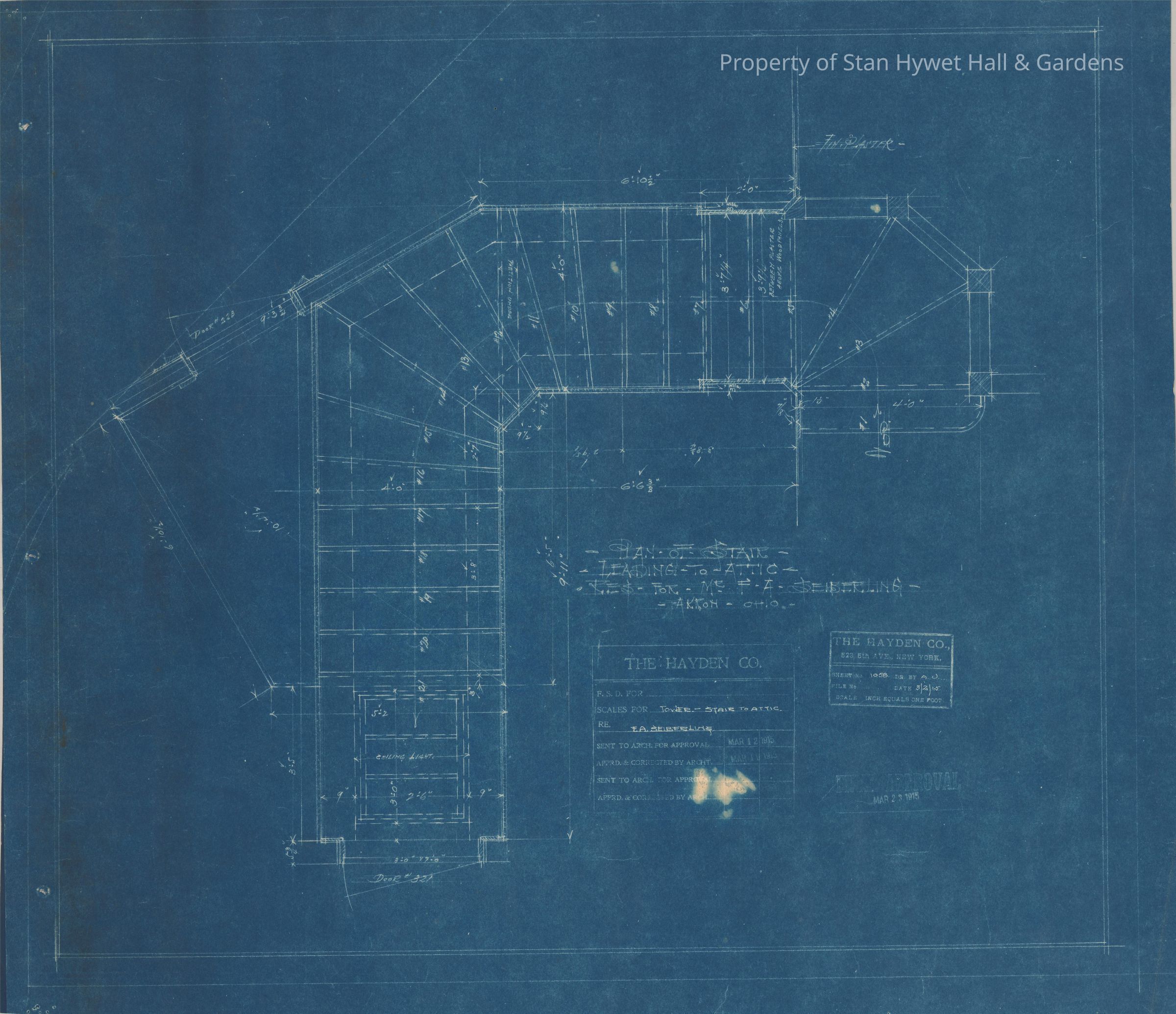 Historic Blueprint: Plan of Tower stairs from second floor landing to the third floor of Stan Hywet Hall. Titled "Plan of stairs leading to attic, Res. for Mr. F.A. Seiberling, Akron Ohio".