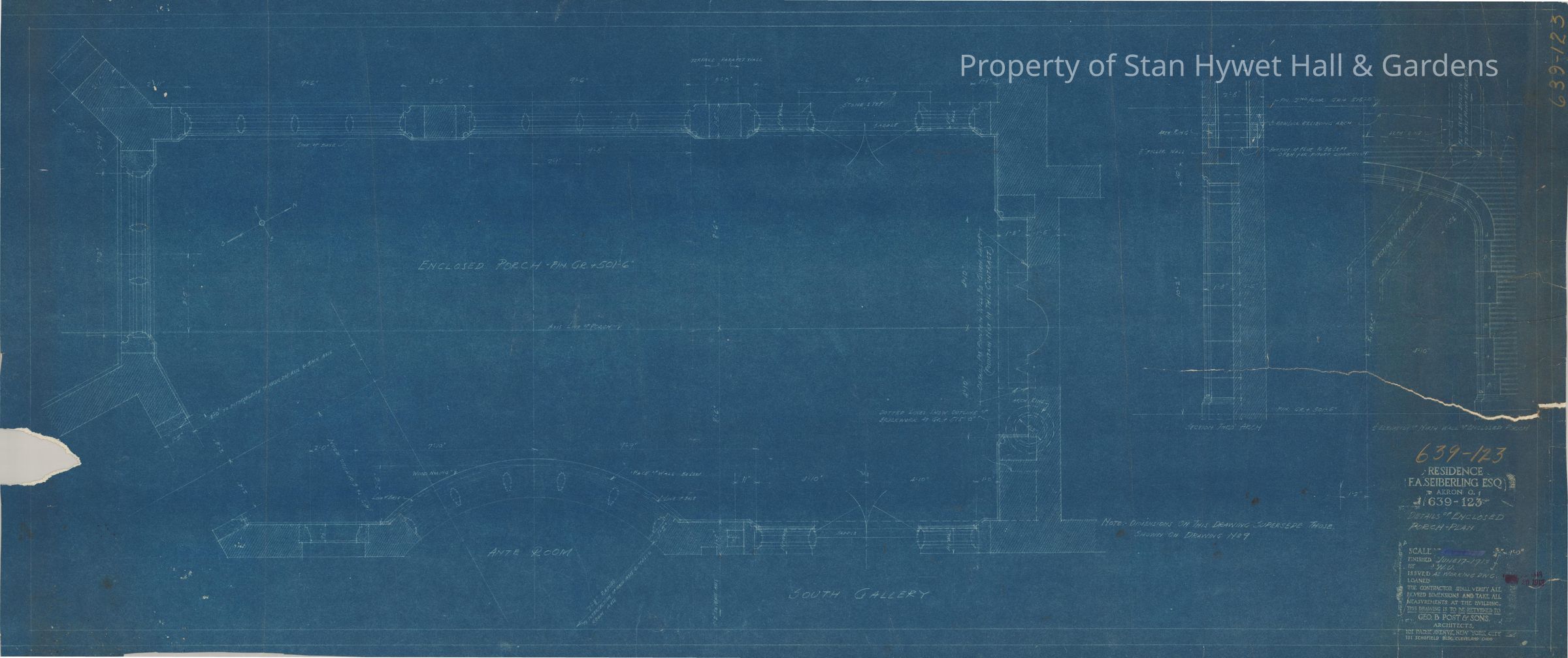 Historic blueprint: Detailed drawing of the plan for the West Porch, including parts of the Round Room and Linenfold Hallway. Titled "Details of Enclosed Porch-Plan".