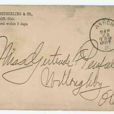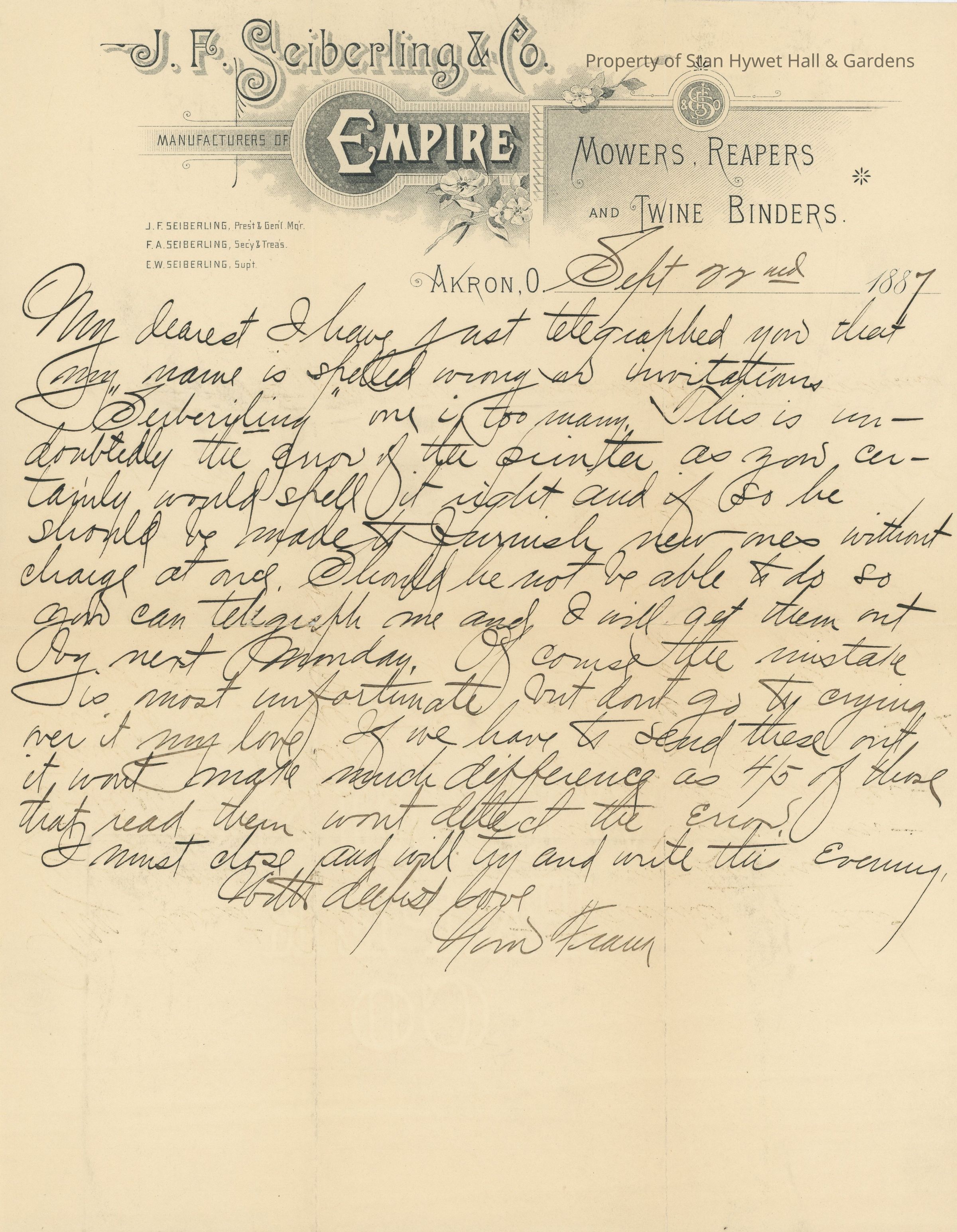Handwritten letter on J.F. Seiberling & Co. Empire Mowers, Reapers and Twine Binders letterhead. From Frank Seiberling to Gertrude Penfield regarding a mistake noticed in the wedding invitations where Seiberling is spelled wrong with "one i too many" "Seiberiling". He goes on to assure her that it will be taken care of in time.Subject