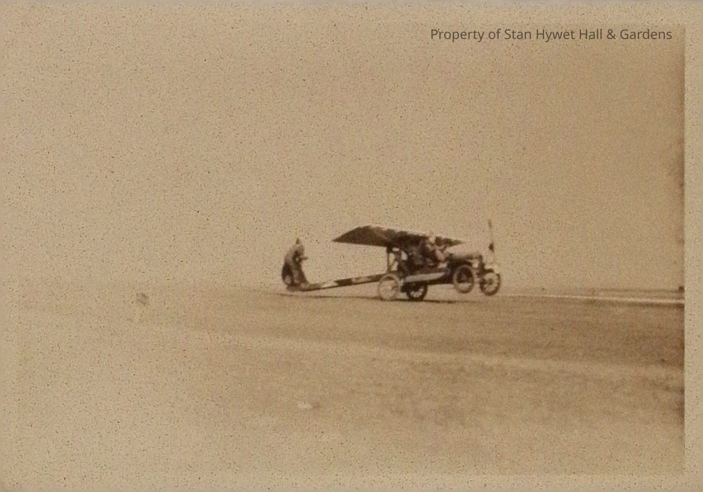 Black and white photograph of an early single-propeller aircraft in an empty field with a man standing on the back, looks like a car with four wheels, a single wing and tailfin.Collection