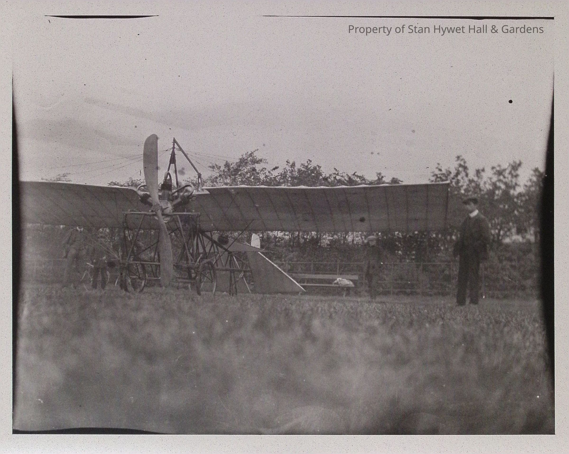 Black and white photo of an early single-propeller aircraft with a simple and lightweight design, from the early 20th century, characterized by its exposed framework and wide wingspan, situated in an open grassy area under an overcast sky. Five men are present; three stand near the aircraft on the left, one stands on the far fight dressed in period attire with a hat, one appears to stand behind and to the right of the plane. The surrounding landscape includes trees and a fence.Collection