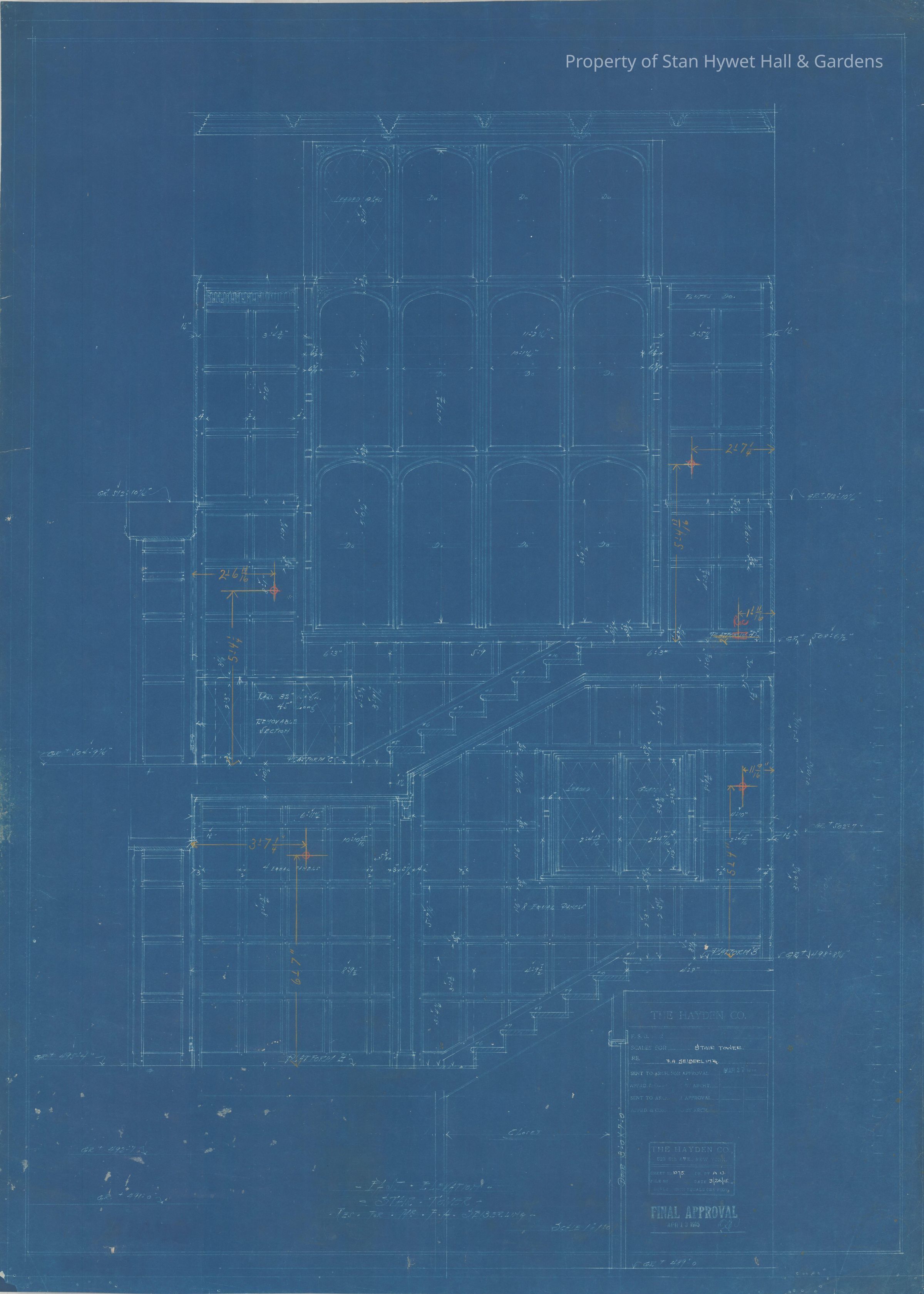 Historic blueprint: East elevation of Tower stairs in Stan Hywet Hall, including stained-glass window spaces. Titled "East Elevation Stairs Tower Res. for Mr. F.A. Seiberling".