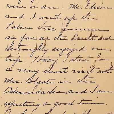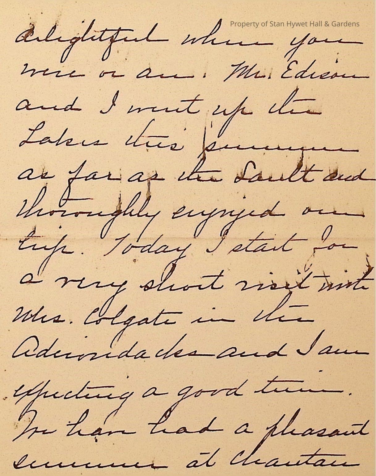 It must be cool and delightful where you were [ill.]. Mr. Edison and I went up the Lakes this summer as far as the Sault and thoroughly enjoyed our trip. Today I start for a very short visit with Mrs. Colgate in the Adirondacks and I am expecting a good time. We have had a pleasant summer at Chautau-qua and I feel quite ambitious to get at something now but soon there will be such a whirl of things that you simply do not know which to take up first. Orange is a place having so many different interests.