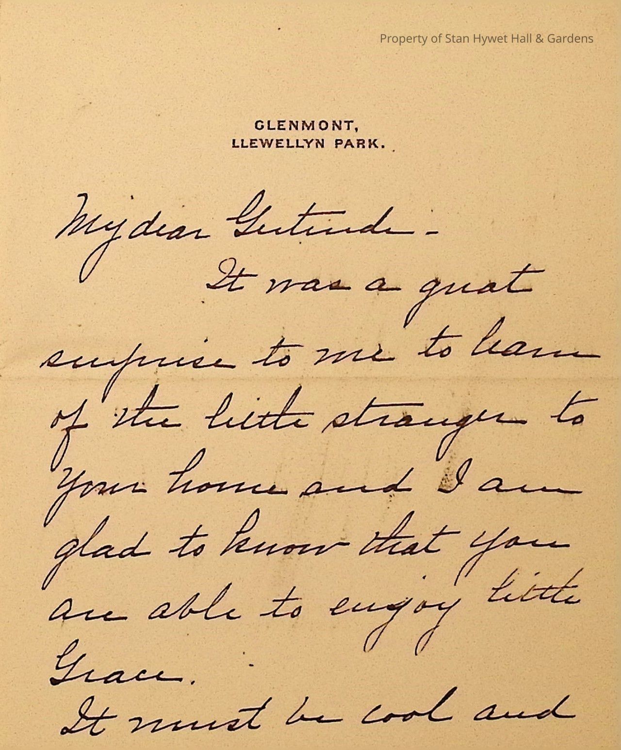 My dear Gertrude, It was a great surprise to me to learn of the little stranger to your home and I am glad to know that you are able to enjoy little Grace.