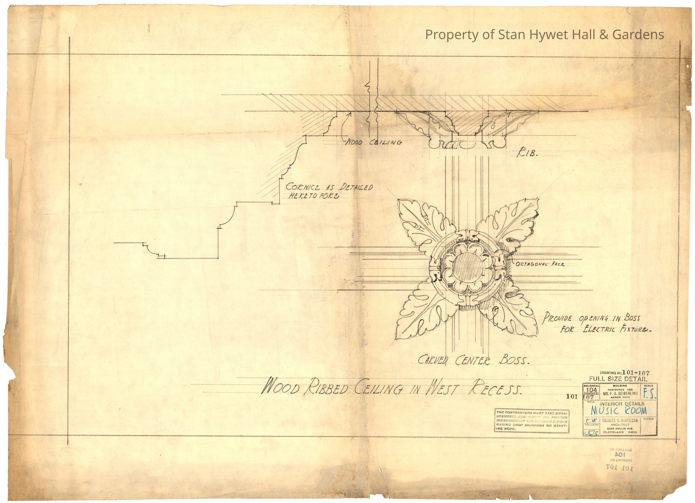 Historic Drawing: Full sized detail of woodwork carving design for ceiling of Music Room Alcove in Stan Hywet Hall. Titled "Interior Details Music Room: Wood Ribbed Ceiling in West Recess".