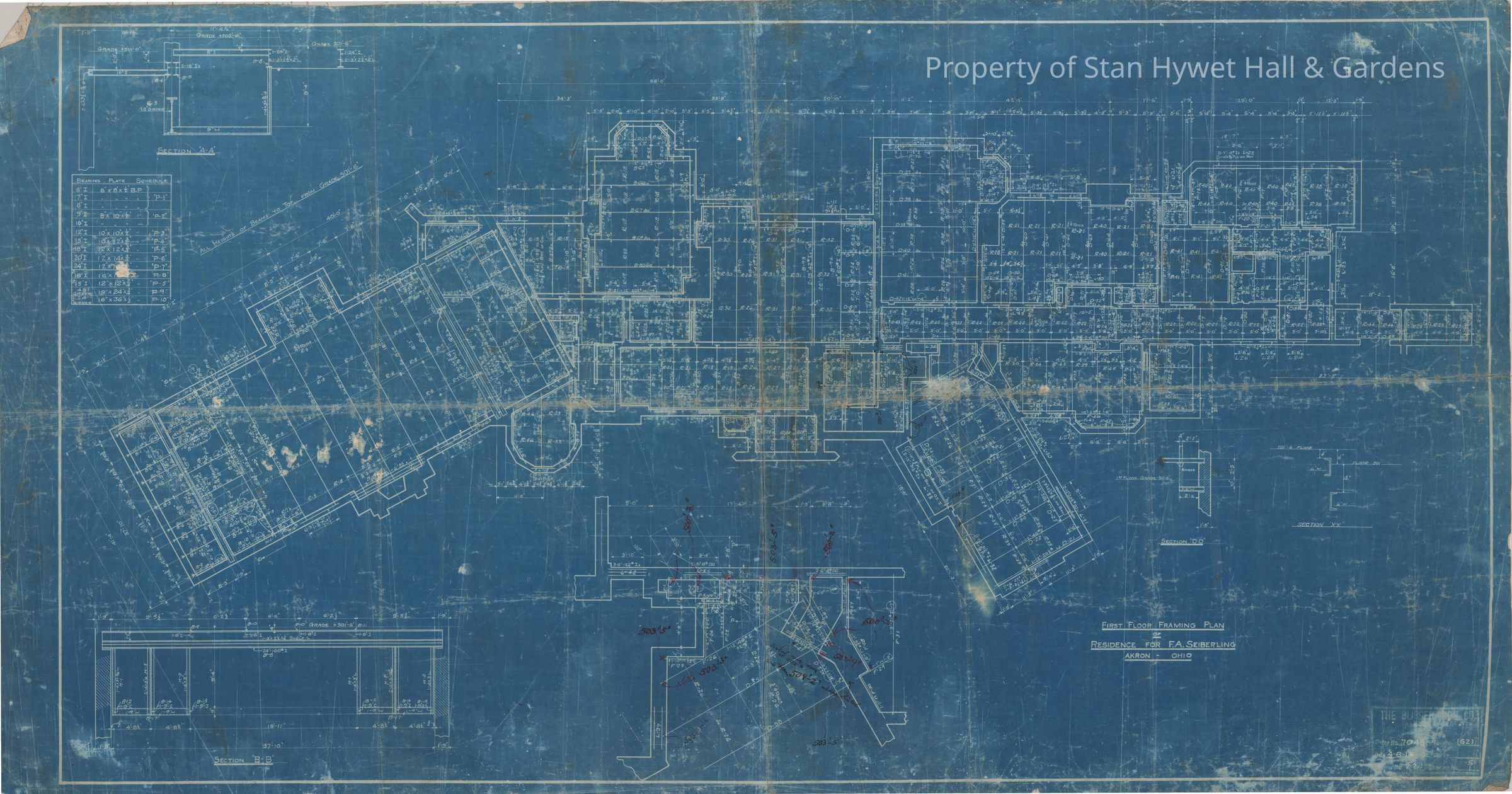 Historic Blueprint: Framing plan for first floor of Stan Hywet Hall. Titled "First Floor Framing Plan for Residence of F.A. Seiberling, Akron Ohio".Collection