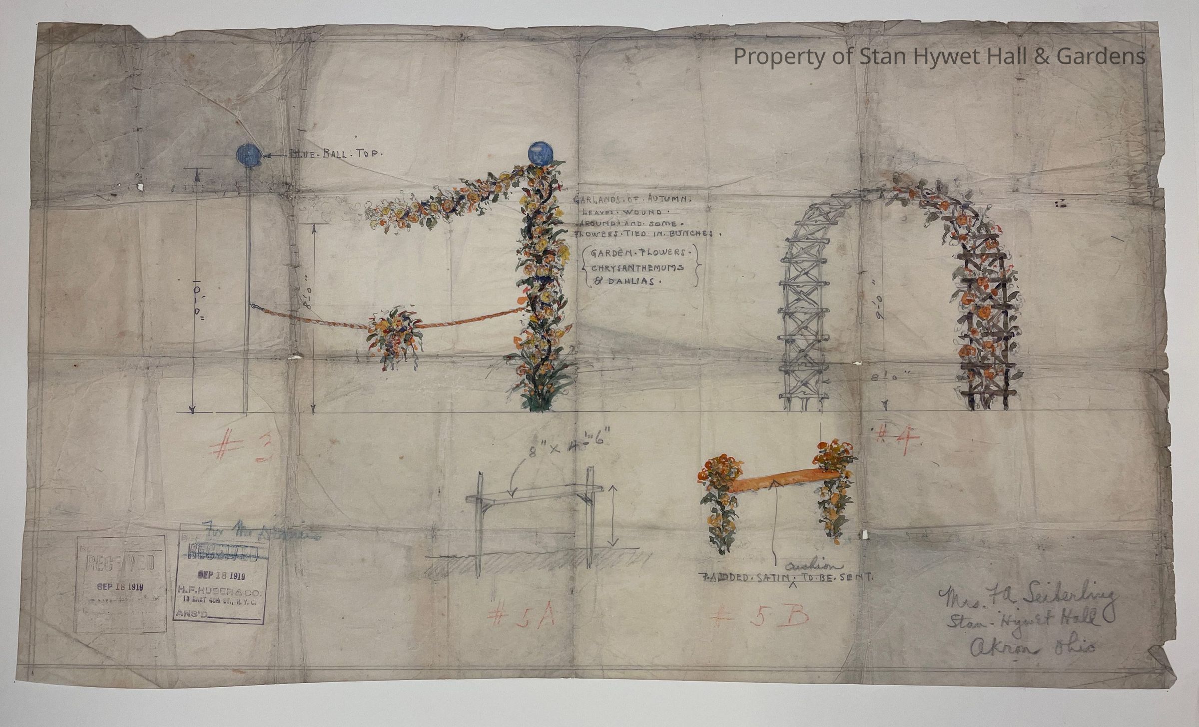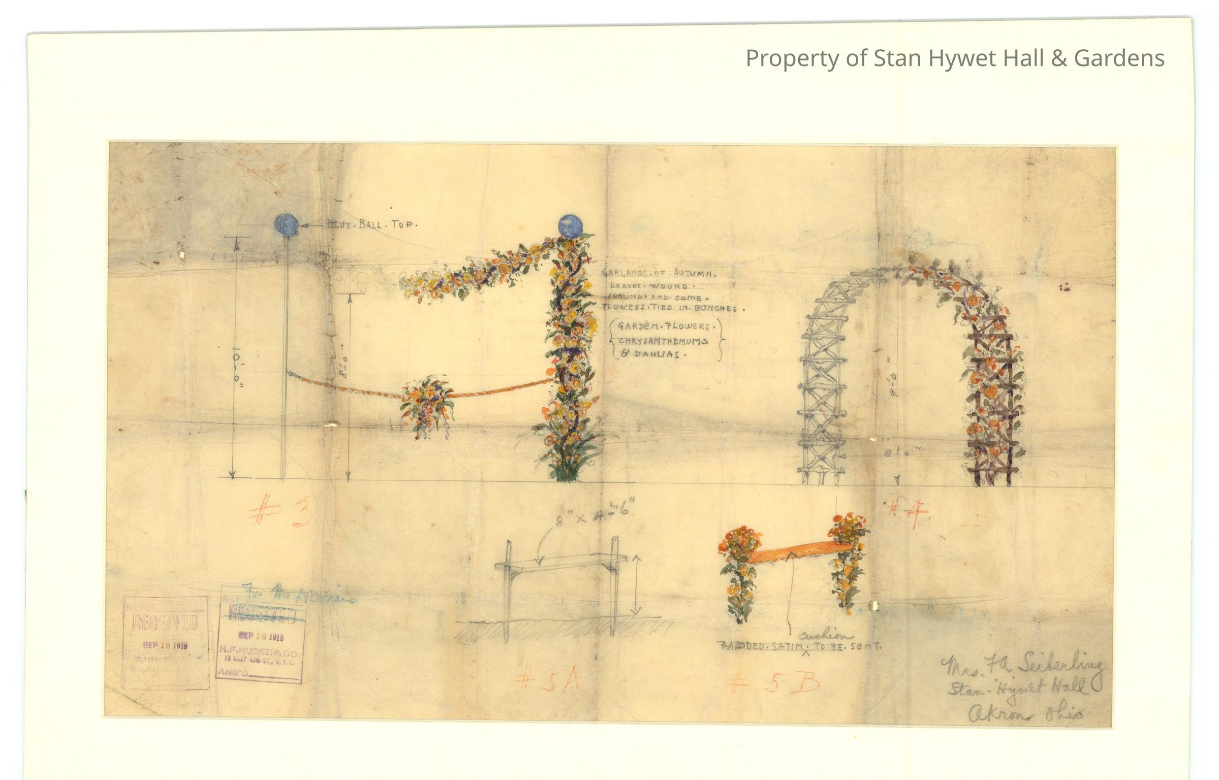Historic drawing: Concept for décor at Virginia Seiberling's wedding in the Dell at Stan Hywet Hall. Sketches of floral archways. Original drawing, pencil, watercolor, colored pencil, on tissue.Collection
