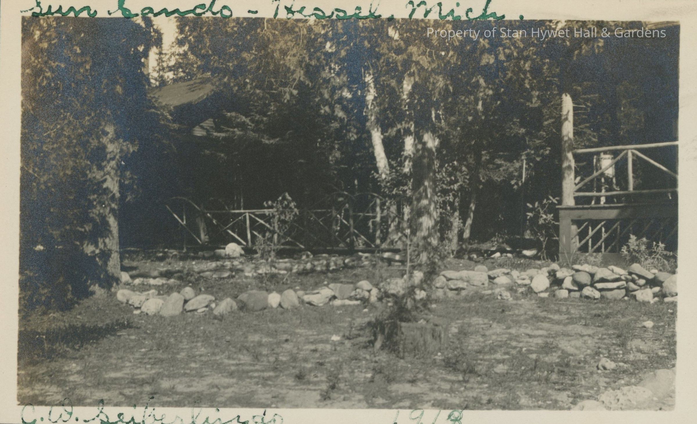 Black and white photographic print with white border. One of a series of 66 photos. Front of a cabin with a rustic log railing around the porch. Most of the cabin in obscured by trees. Hand written in green ink at top border "Sun Sands - Hessel, Mich." and on bottom border "C.W. Seiberlings 1913 (or 14?)"Photograph Details