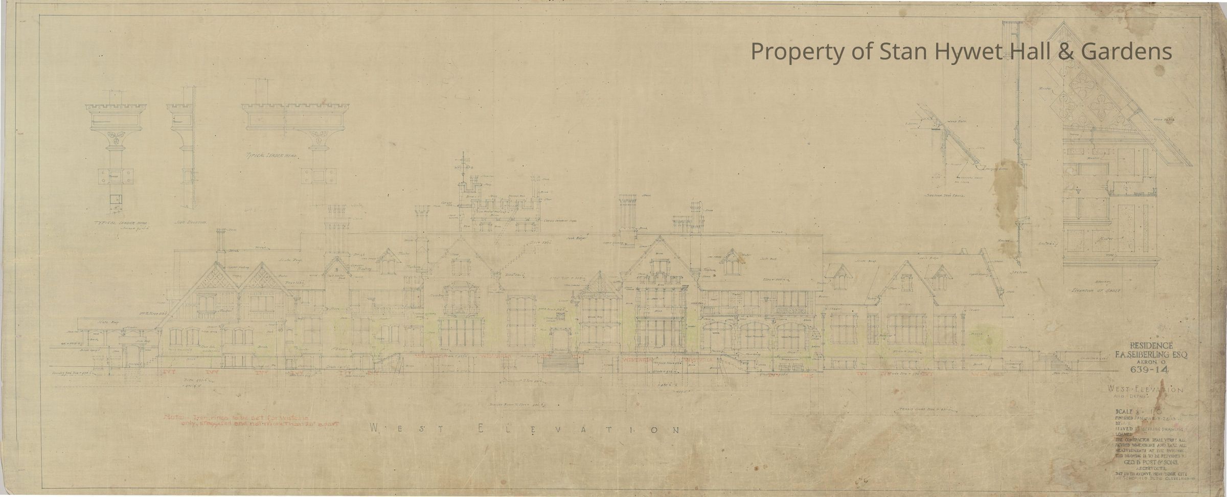 Historic drawing: Detailed drawing of the entire west elevation of the Manor House. Green wax added to show ivy. Titled "West Elevation and Details".
