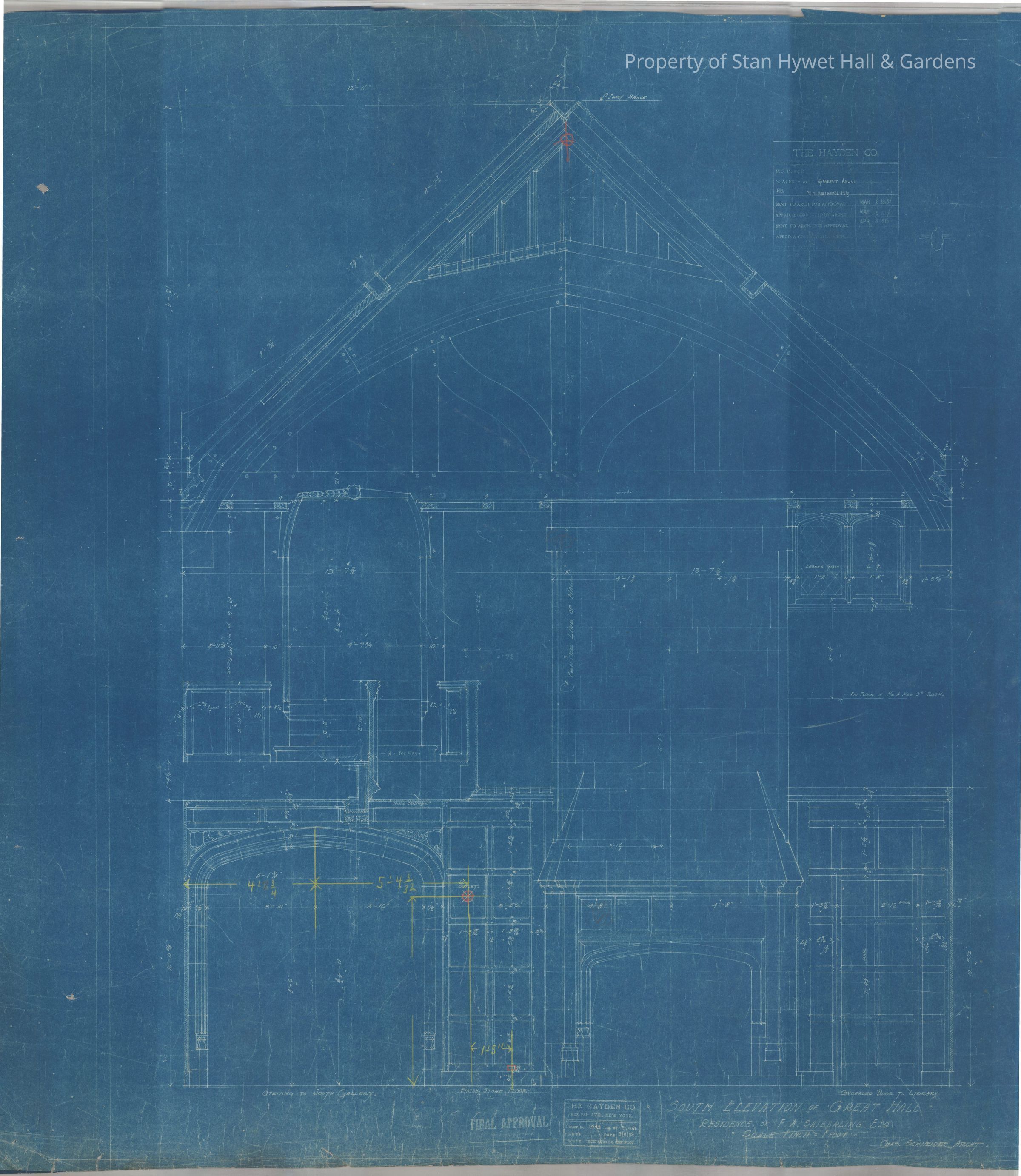Historic blueprint: South elevation of Great Hall in Stan Hywet Hall.