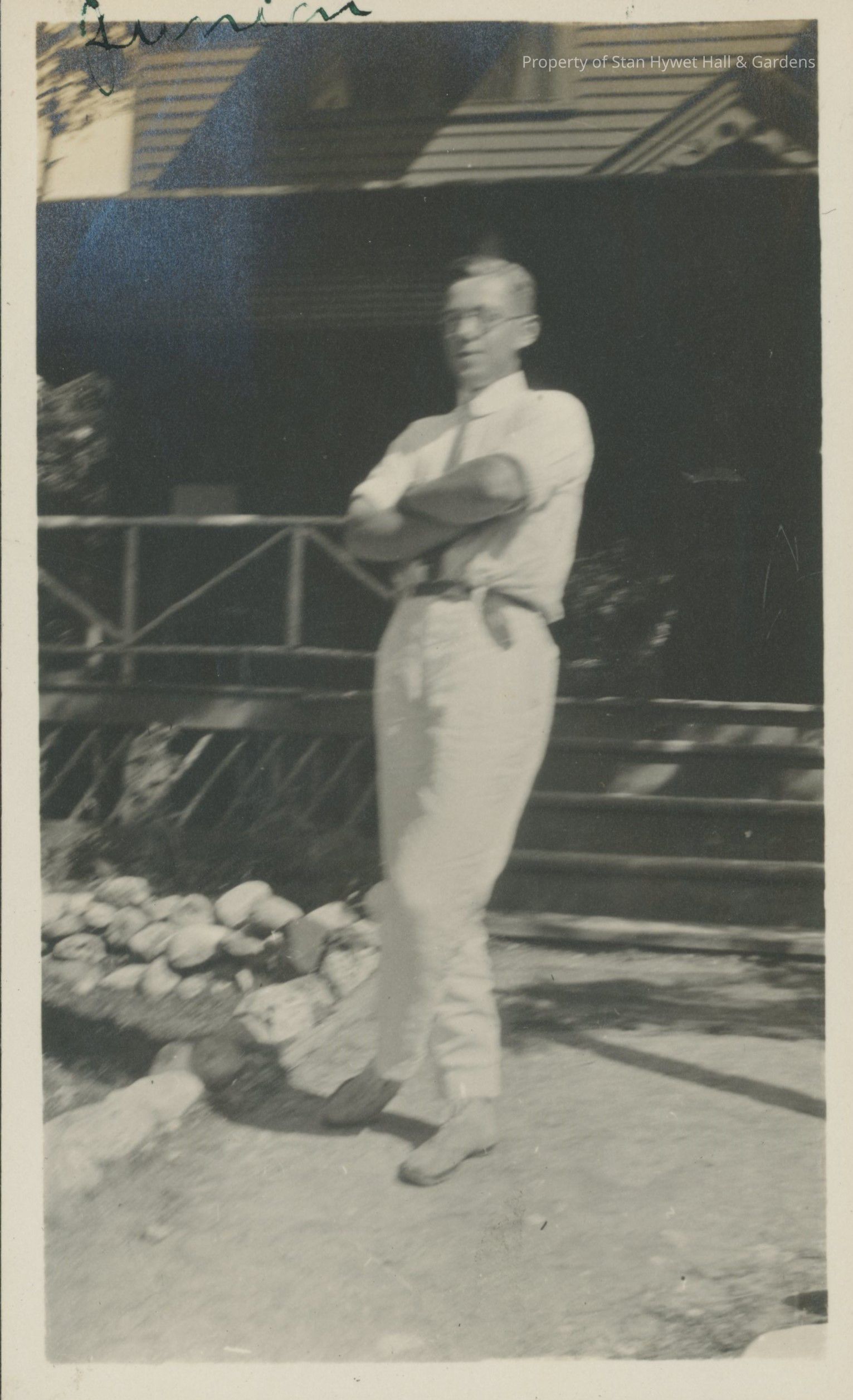 Black and white photographic print with white border. One of a series of 66 photos. Charles W. Seiberling, Jr. standing with arms crossed and left leg crossed over right in front of cottage at Sun Sands. Slightly out of focus. Written in green ink at top "Junior".Photograph Details