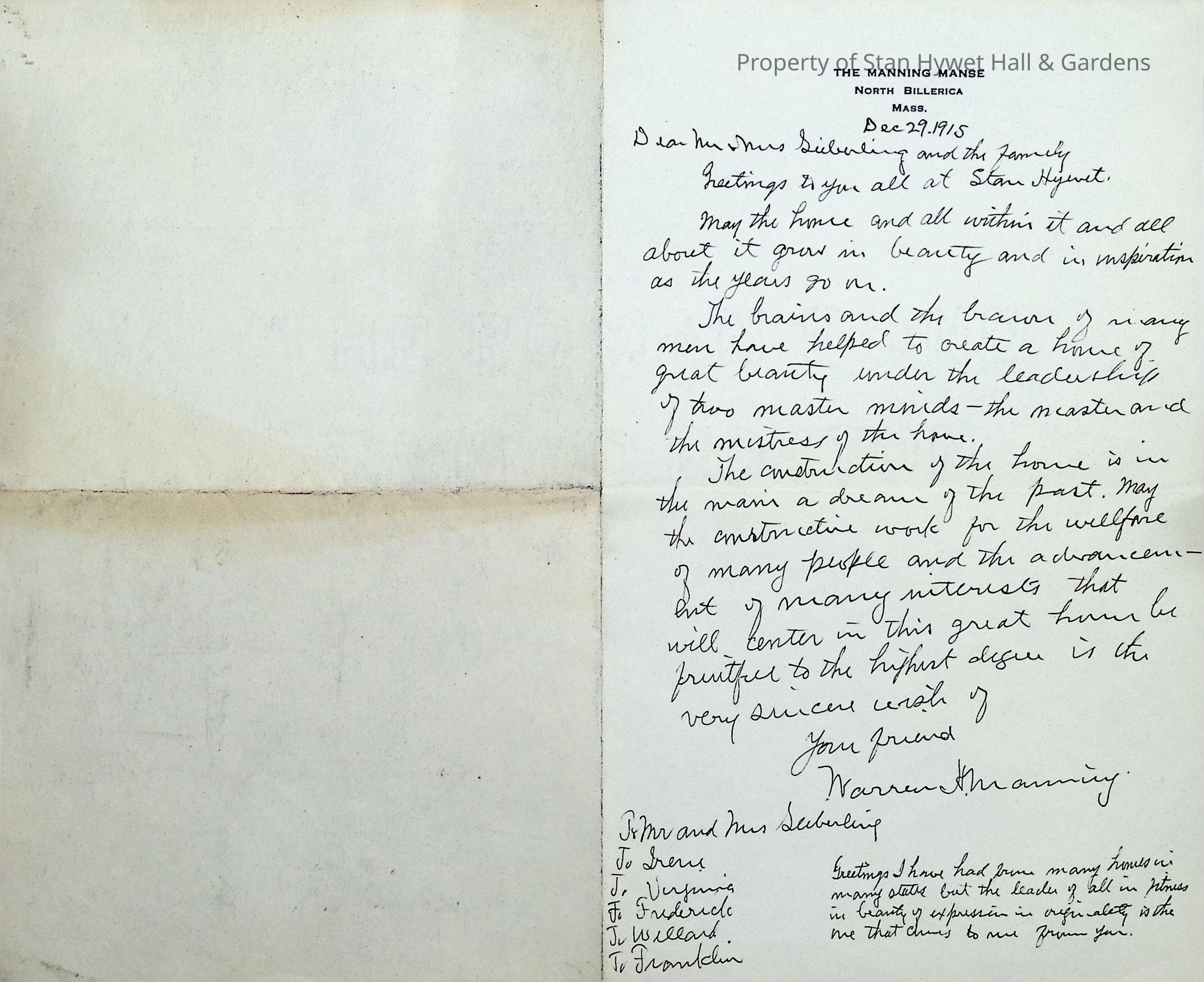 Congratulatory letter from Warren Manning to the Seiberling family upon completion of Stan HywetEntry/Object ID