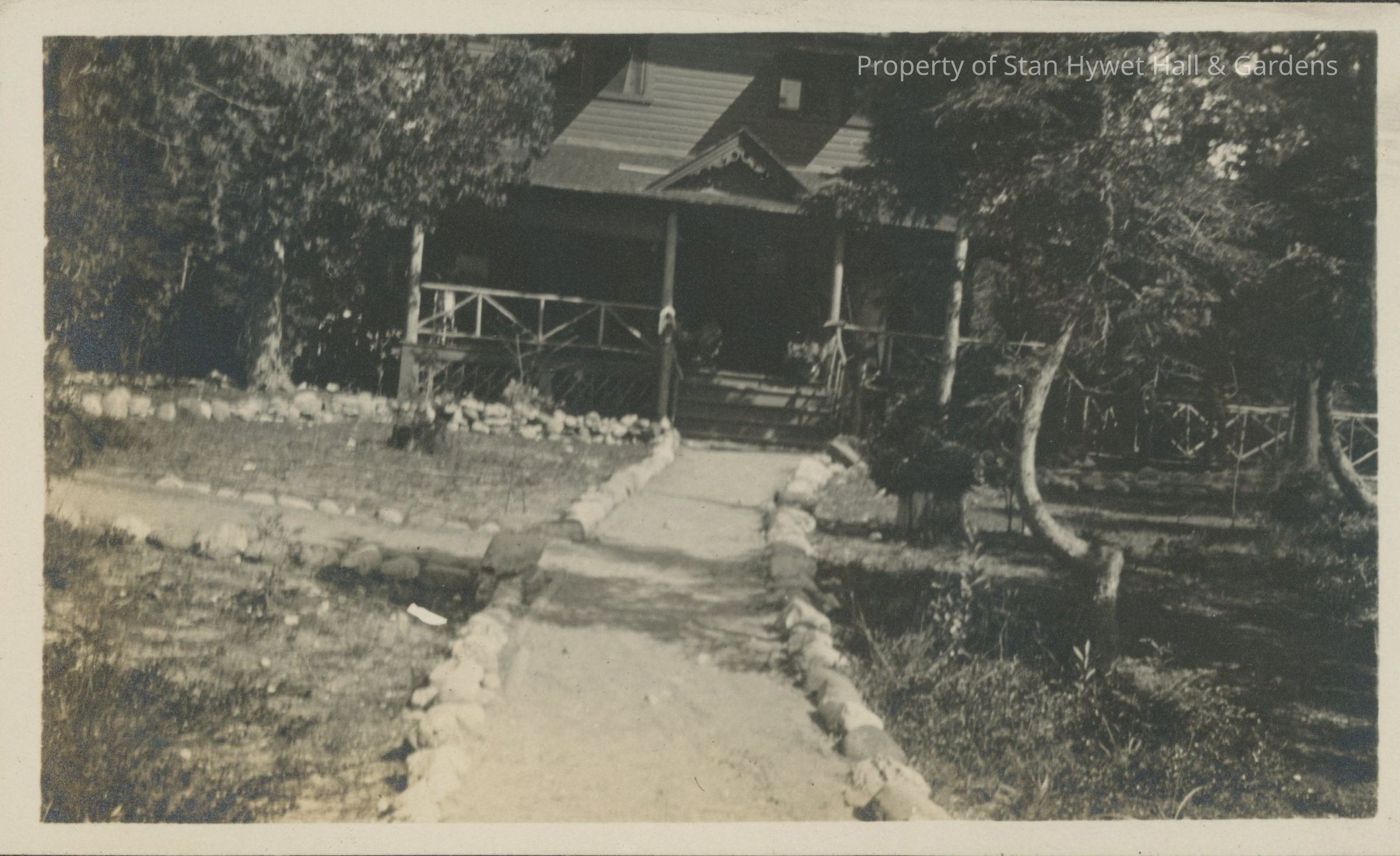 Black and white photographic print with white border. One of a series of 66 photos. Front of Main Cabin at SunSands from rock lined path. Path goes to cabin steps. Another path leads to left at center path mid way to steps. Very curved pine tree at right of path.Photograph Details