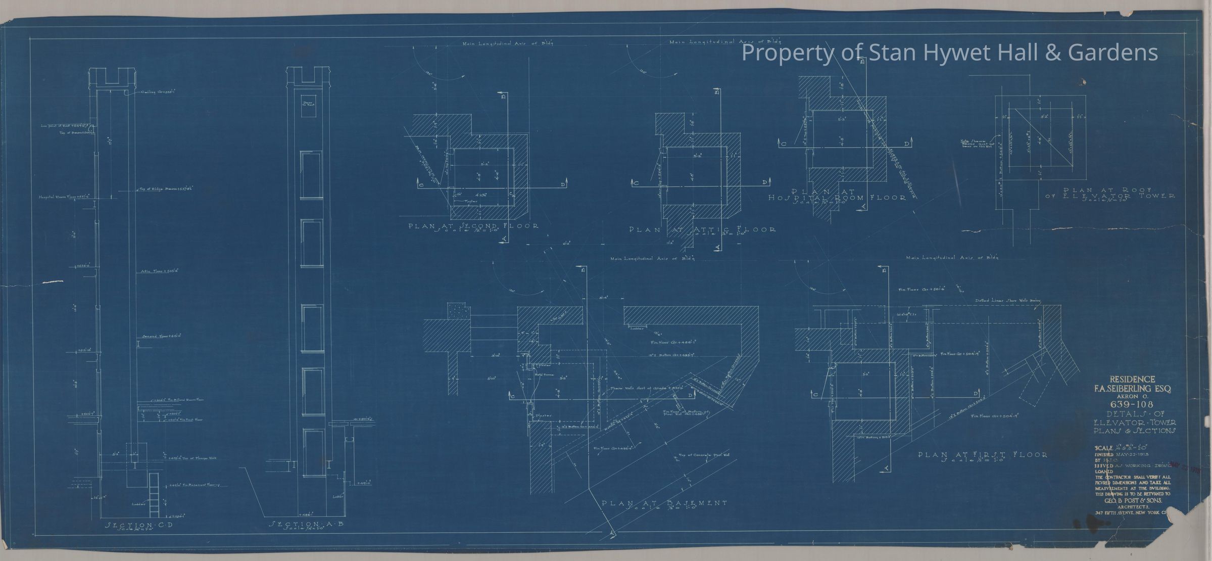 Historic blueprint: Detailed drawing of plans for the Passenger Elevator for each floor of the house and a section of the elevator shaft. Titled "[Detals] of Elevator Tower Plans & Sections".