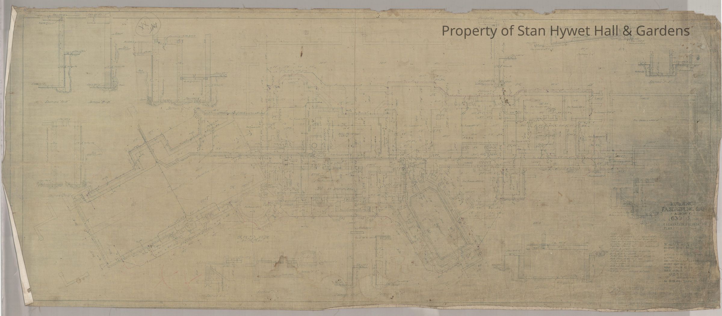 Historic drawing: Plan for the excavation of the foundation for the Manor House. Titled "Excavation & Foundation Plan".