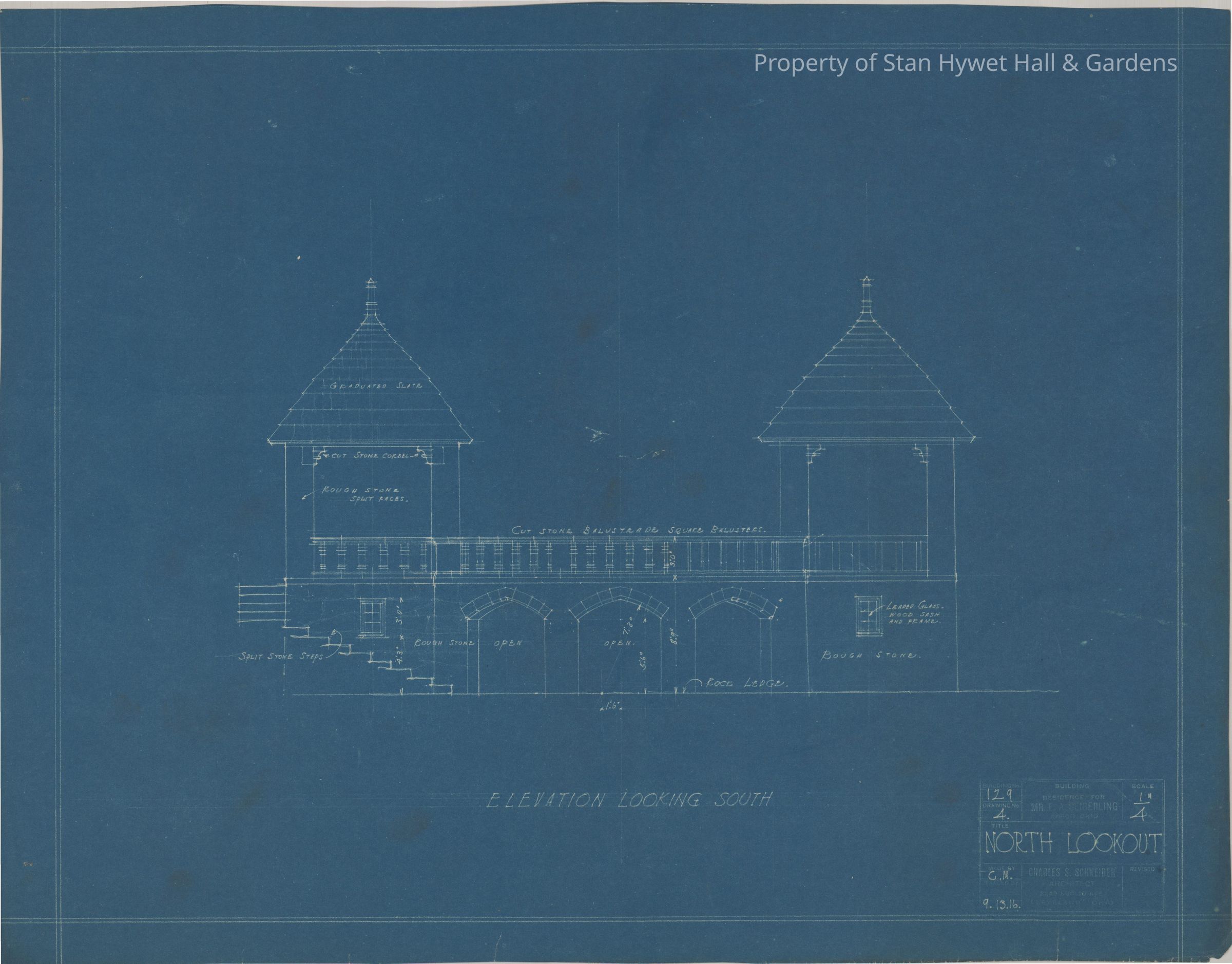 Historic Blueprint: North elevation of the Tea Houses. Titled "Elevation Looking South; North Lookout".