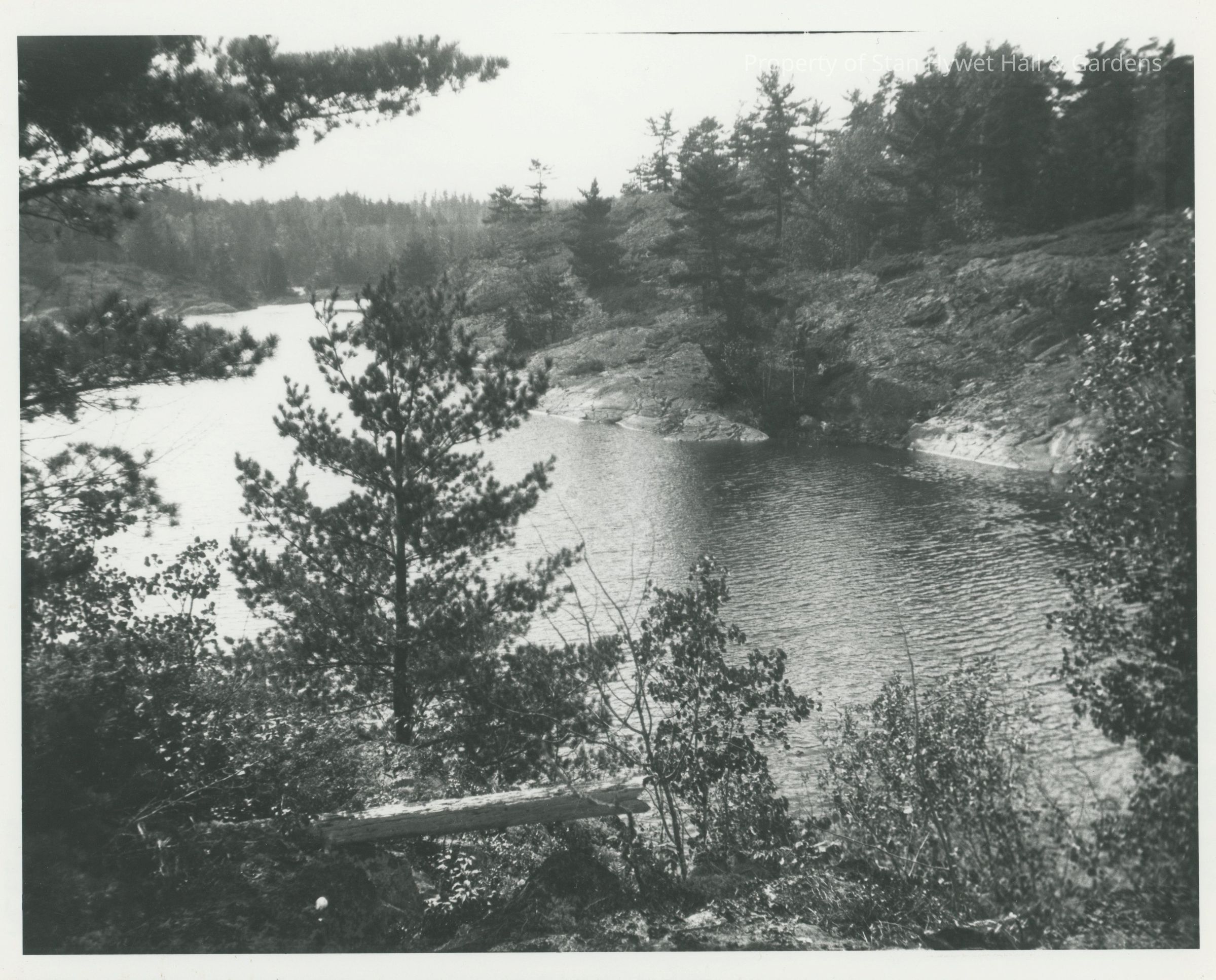Black and white photograph of a calm river taken from the shoreline above the river. The riverbank on the far side is a steep rocky slope heavily wooded at the top.Photograph Details