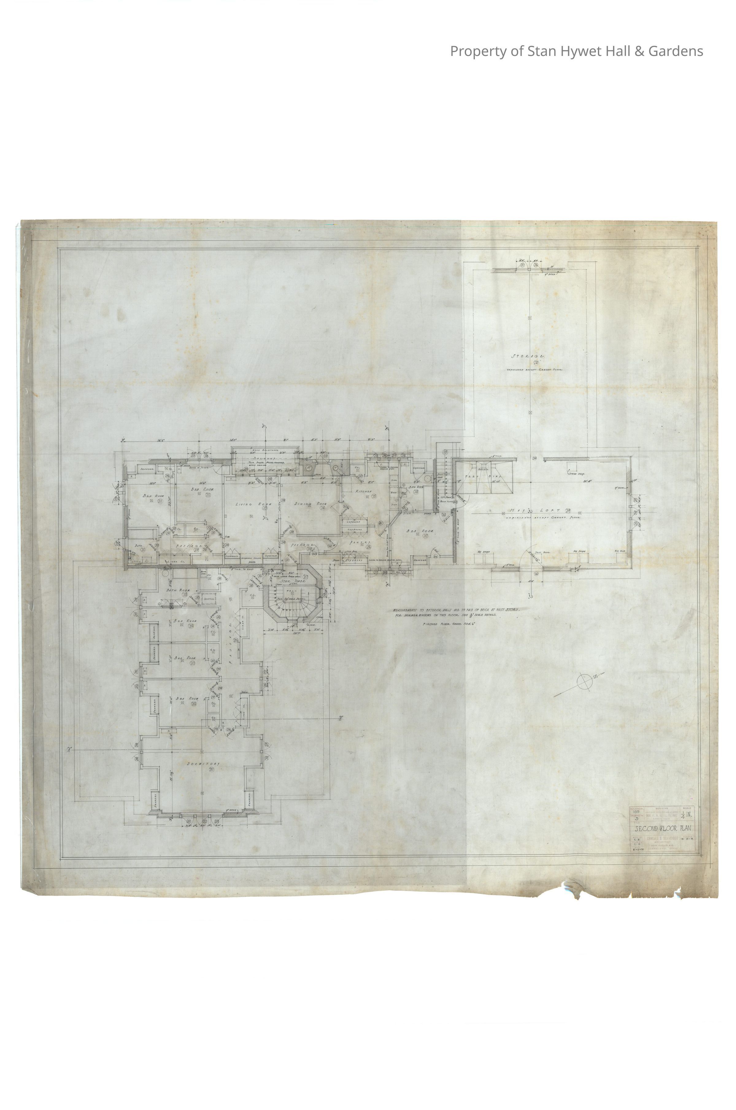 Historic drawing: Second floor plan of the Carriage House on Stan Hywet estate. Titled "Second Floor Plan".