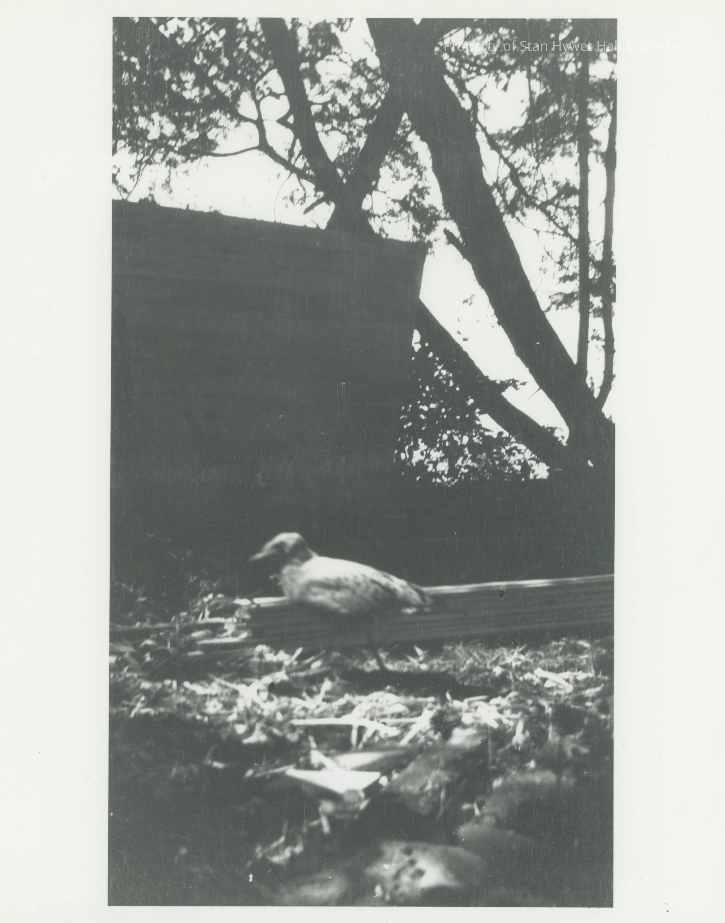 Black and white photograph of a Northern Mockingbird walking around on the ground. There appears to be wooden structure in the shadows in the background.Photograph Details