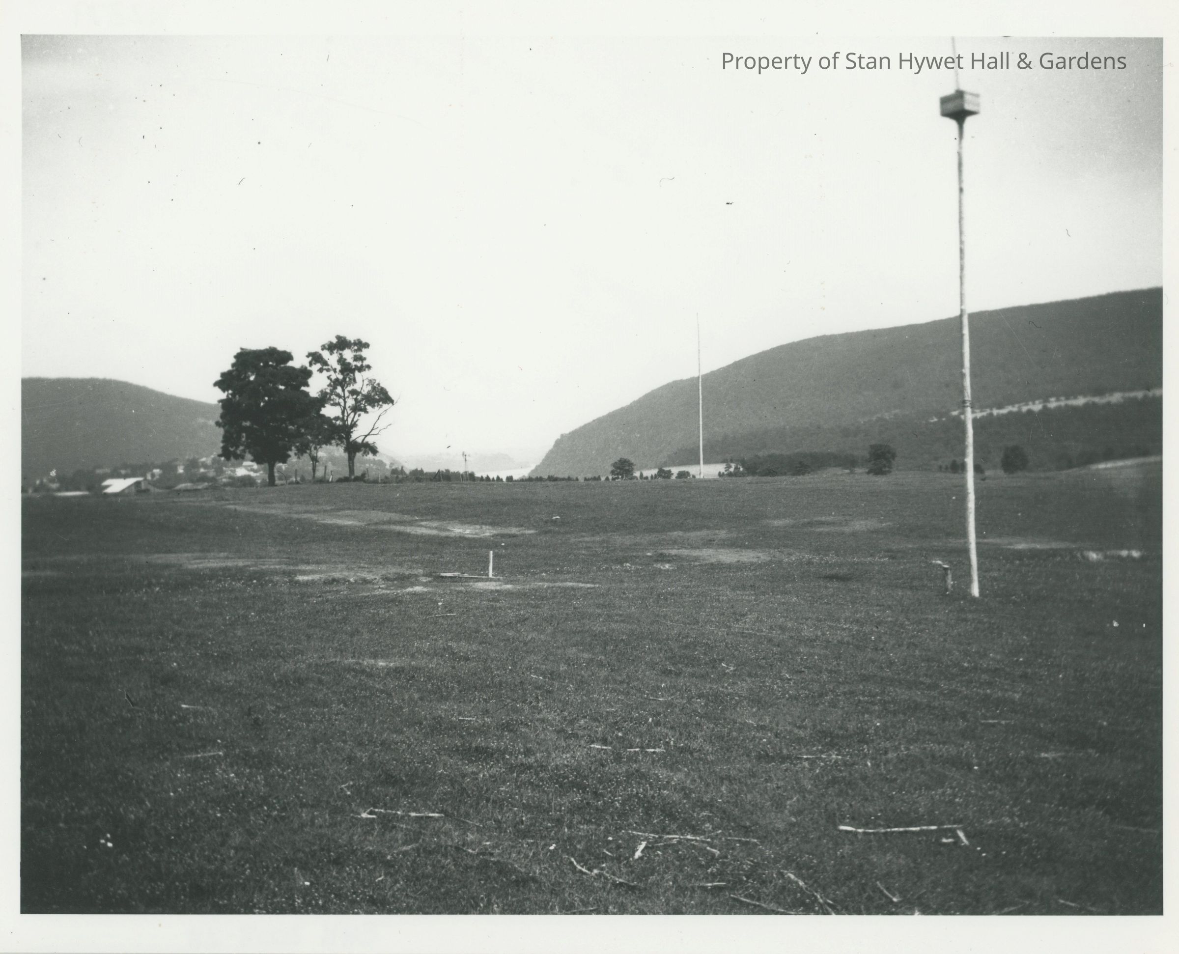 Black and white photograph of an open grassy field with a few tall poles, trees in the background, and hills or mountains in the distance. It looks like a rural area or park, possibly used for recreation or utility purposes.Photograph Details