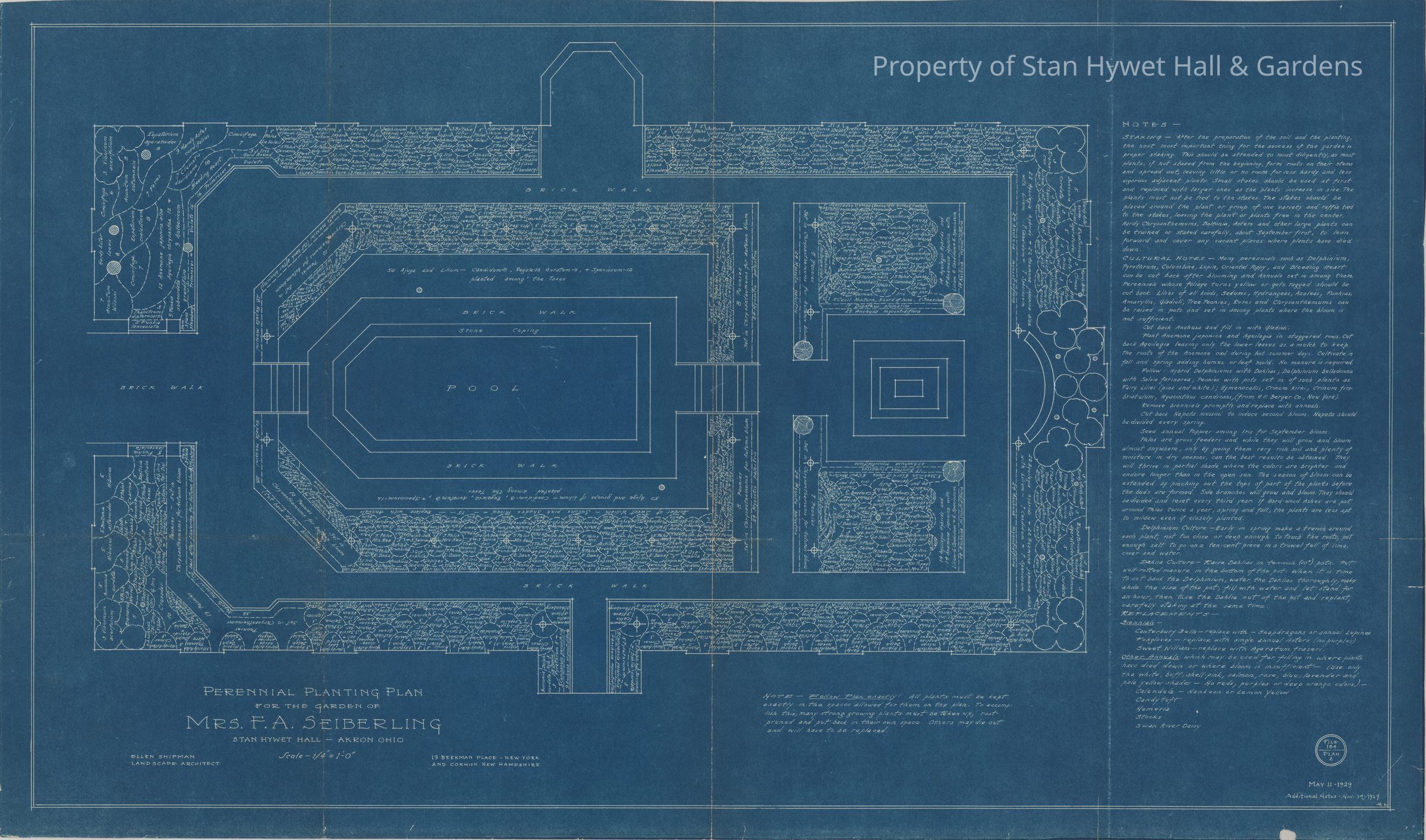 Historic Blueprint: Perennial planting plan for English Garden. Titled "Perennial Planting for the garden of Mrs. F.A. Seiberling".