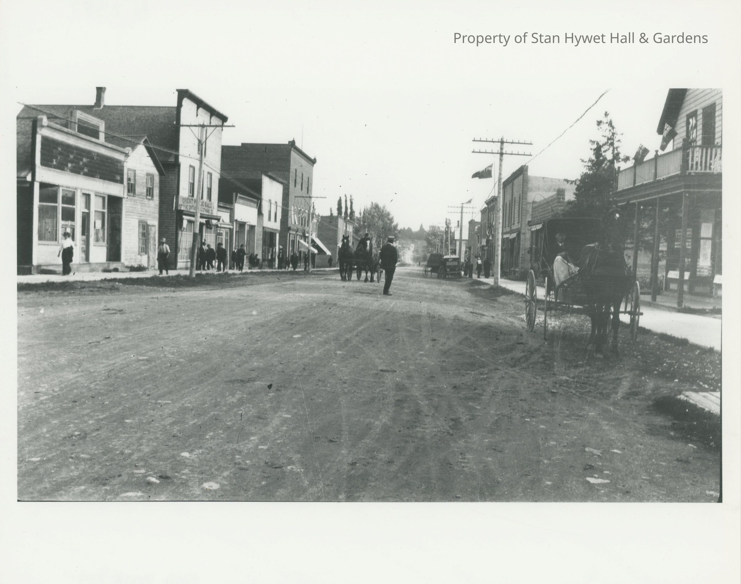 Black and white photograph of a small Town main street of a dirt road with horses and carriages, and people walking on the side walk. Possibly Hessel, MI ca. 1900Photograph Details